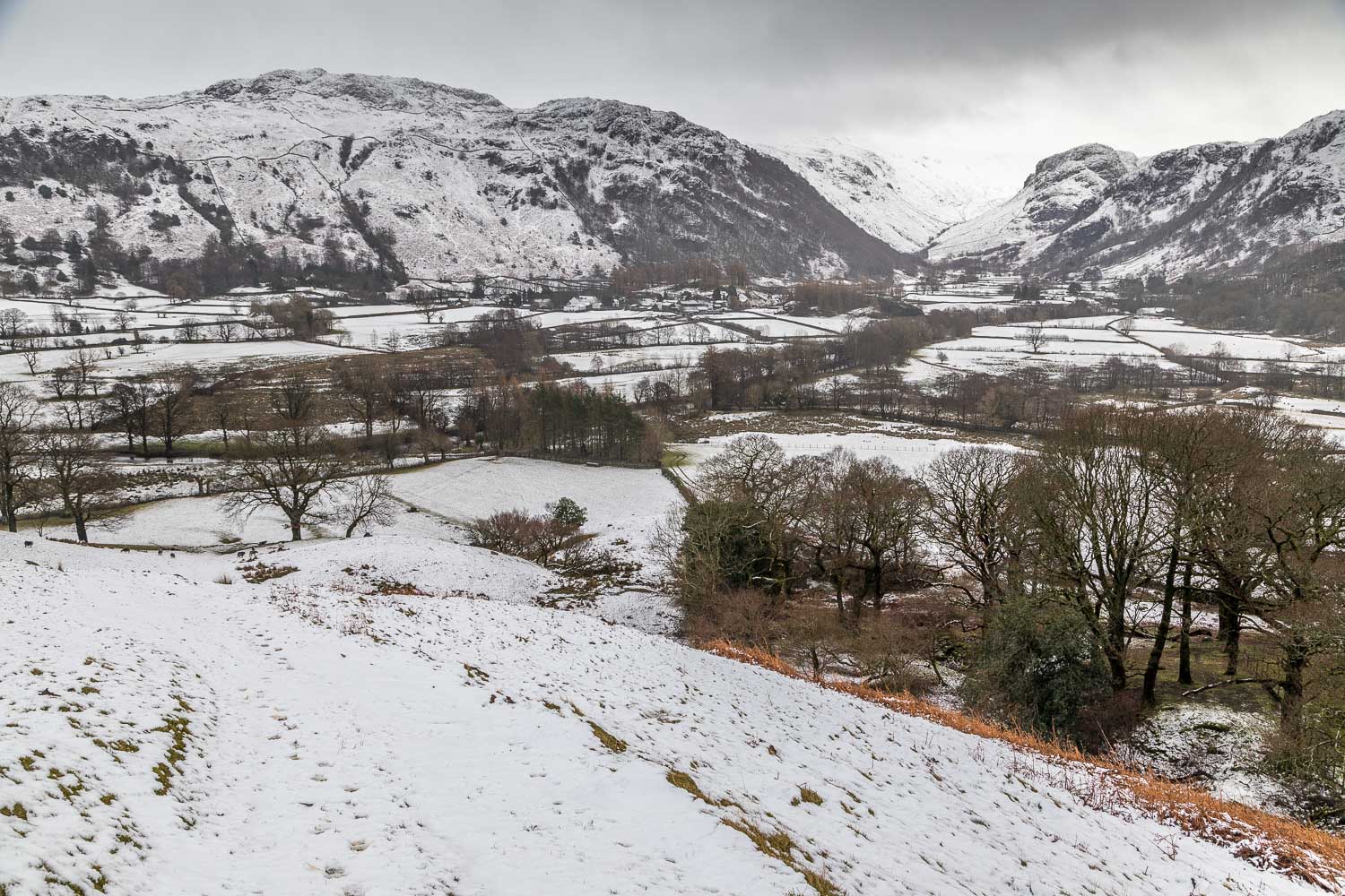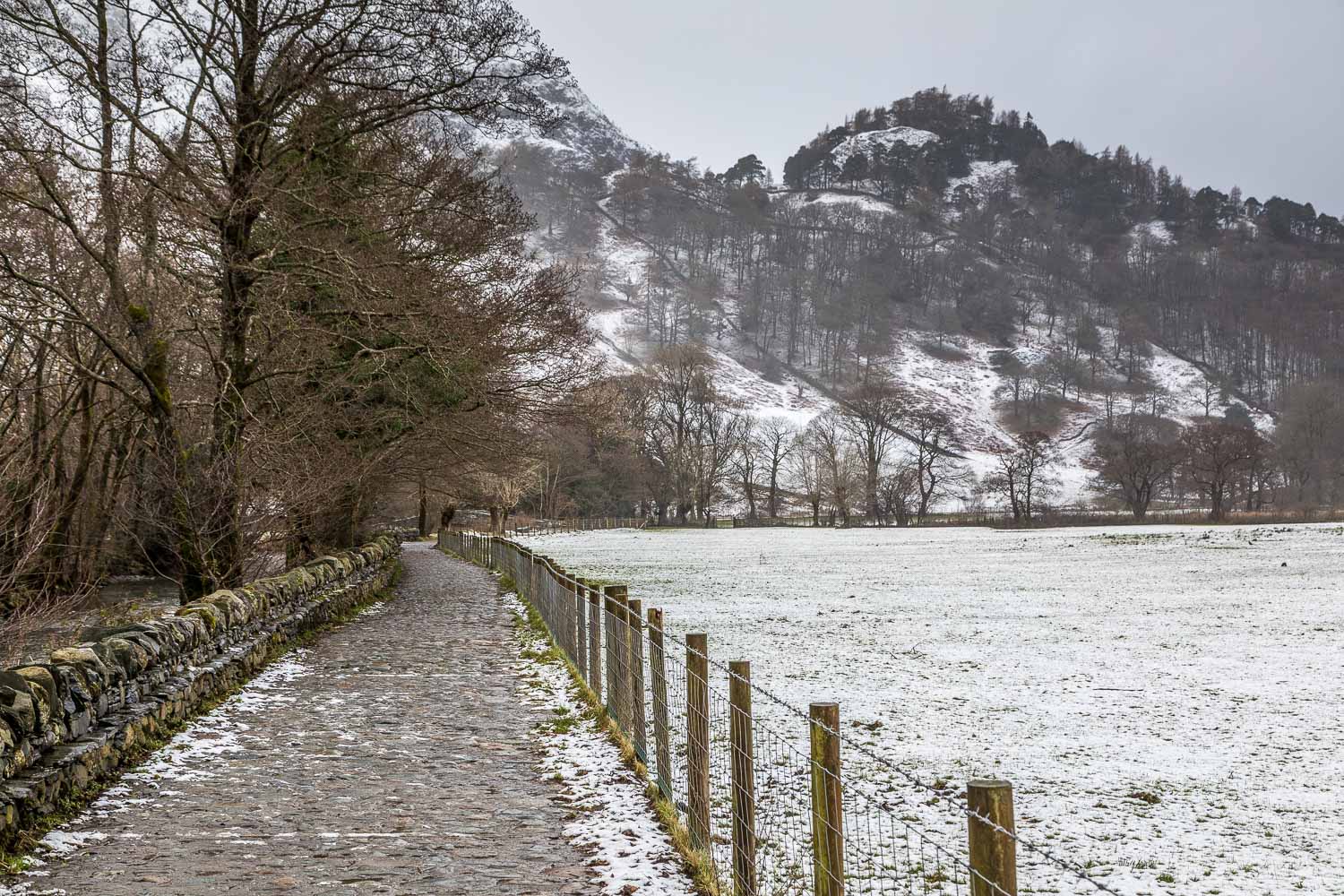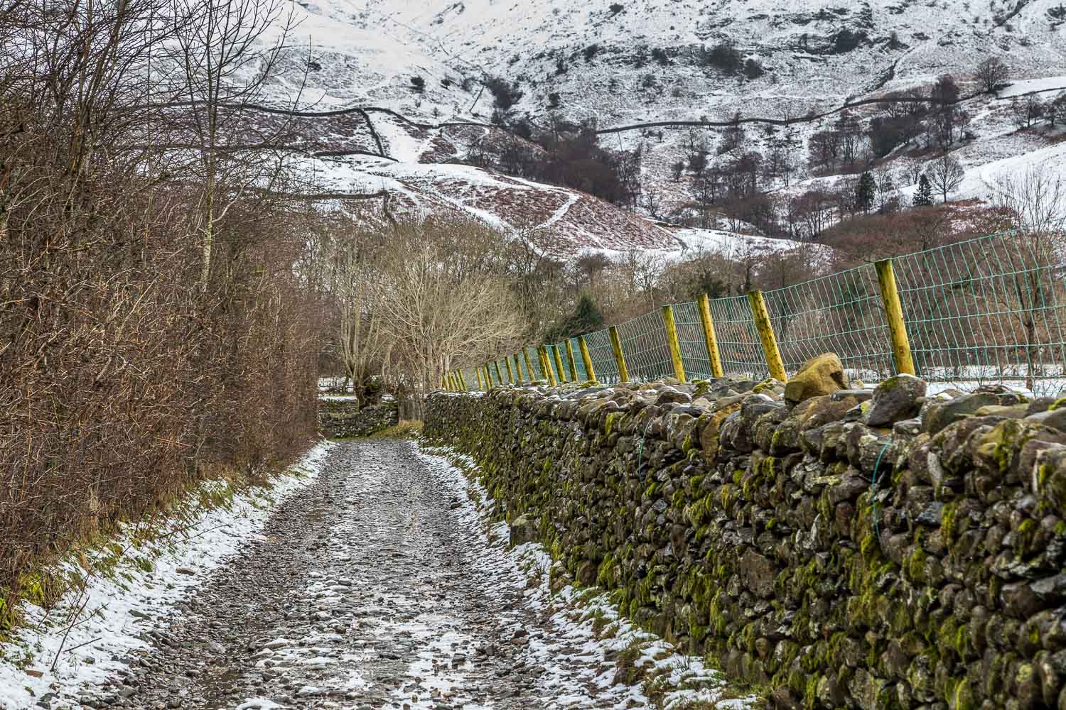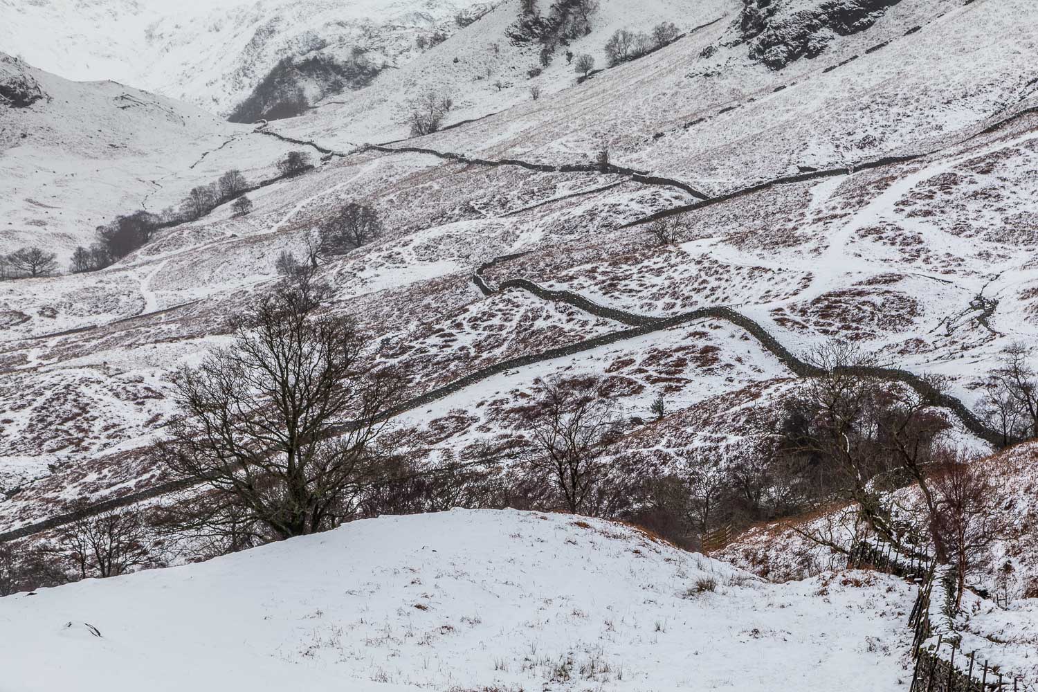 The weather looked quite promising as I set off for Rosthwaite. An overnight dusting of snow showed the Borrowdale fells at their best and I was looking forward to another walk in this most beautiful of valleys. On arrival I parked in a deserted National Trust car park and walked past Yew Tree Farm along a track which is part of the Cumbria Way. After walking beside the River Derwent for a short distance I crossed New Bridge and left the Cumbria Way to climb up Lingy Bank. Last night’s snow made the going quite slippery at times