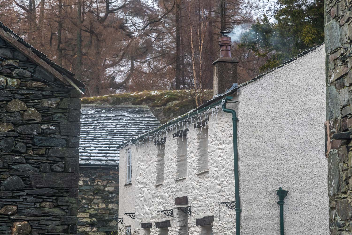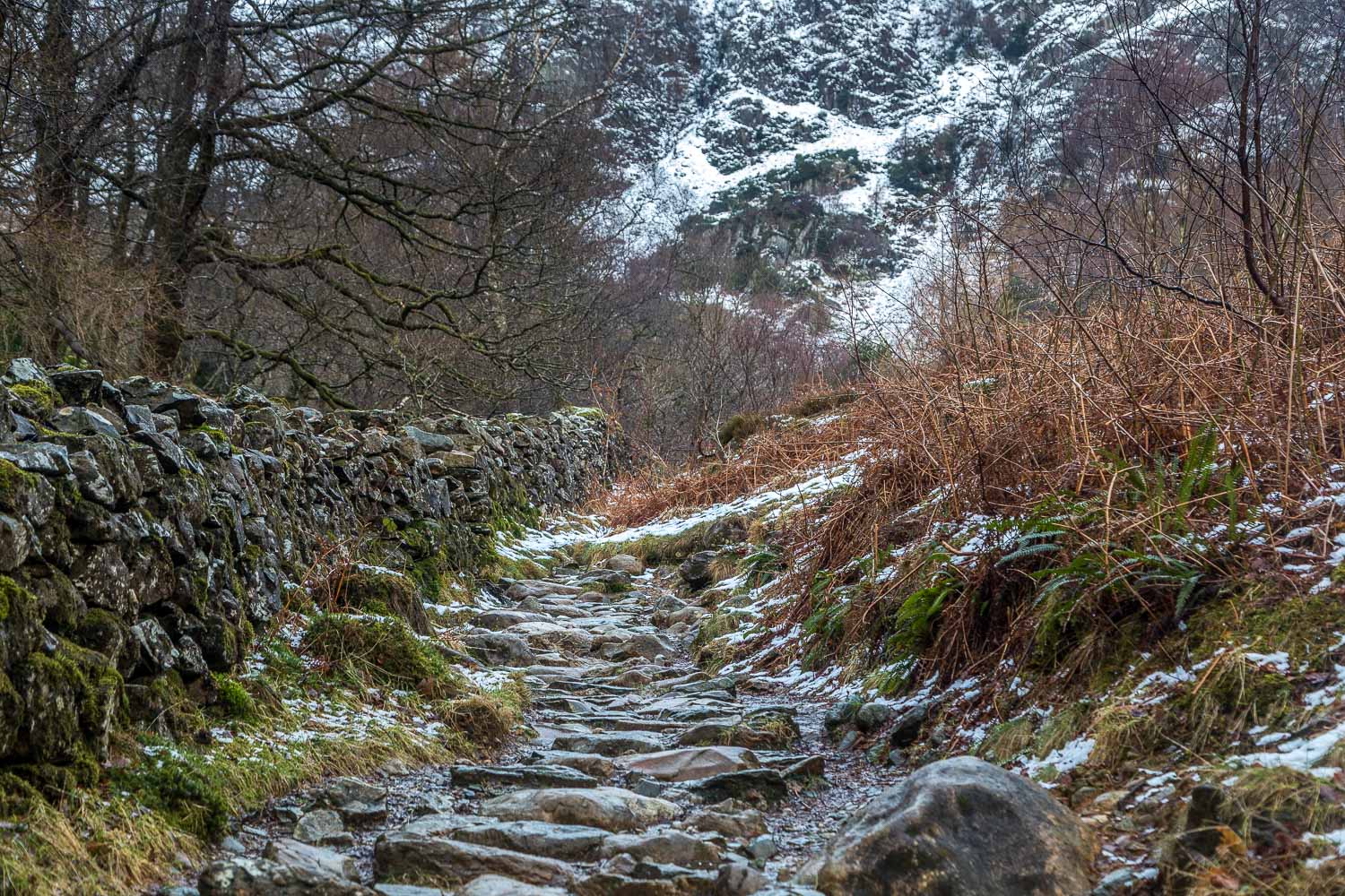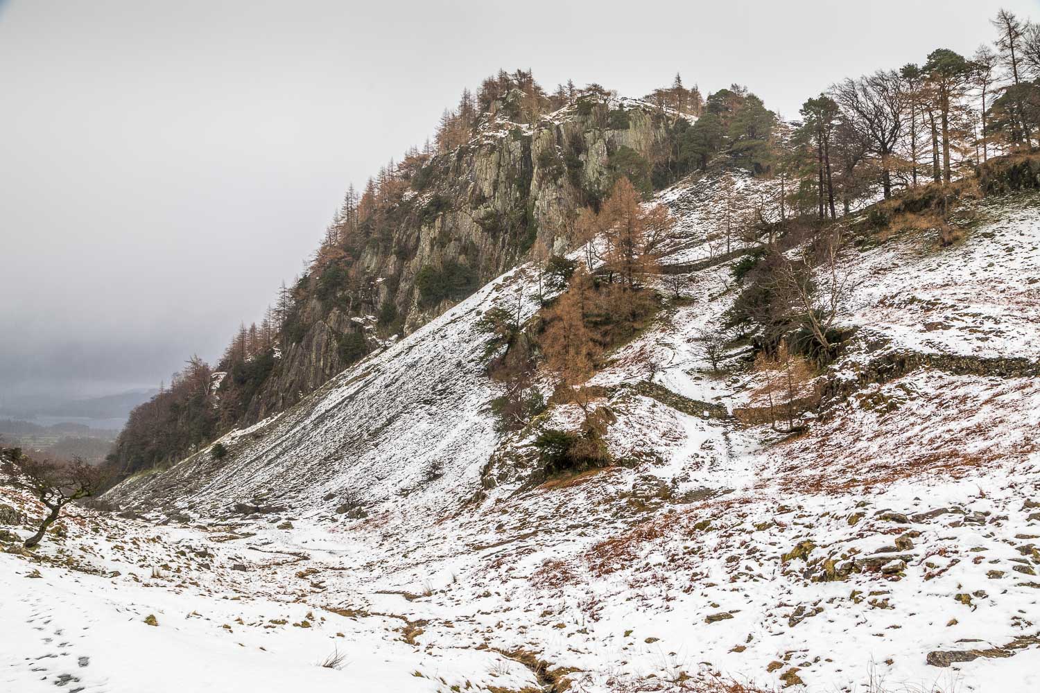 Near the top of the bank the weather started to deteriorate  and as I rejoined the Cumbria Way near the foot of Castle Crag there was a torrential shower of sleety rain, or perhaps it was rainy sleet. Either way, it was unpleasant and the camera had to be stowed away. The timing of the downpour was bad as this section of the path is exceptionally beautiful with far ranging views ahead to the Skiddaw fells. These were completely obscured today. Earlier on I’d toyed with the idea of climbing Castle Crag but in view of the conditions I walked straight past it and descended as quickly as I could into Low Hows Wood