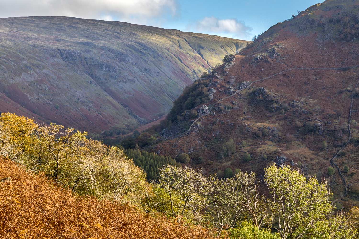From High Doat there followed a down and an up to the glorious mid-level path leading to Castle Crag, the smallest of the fells but one of the best. We’d been intending to climb to the top, but realised that time was running short, so contented ourselves with more good views over Borrowdale from the foot of the fell. (For anyone wishing to climb Castle Crag, the summit is within easy reach of this walk – click here for a visit 6 months ago)