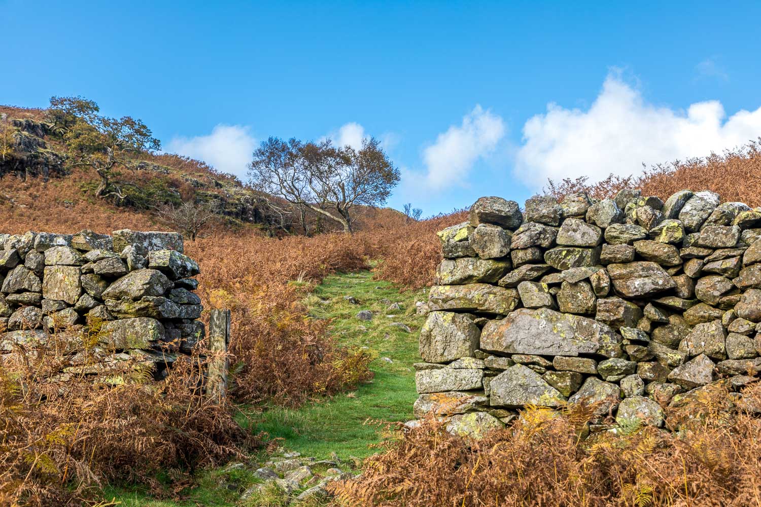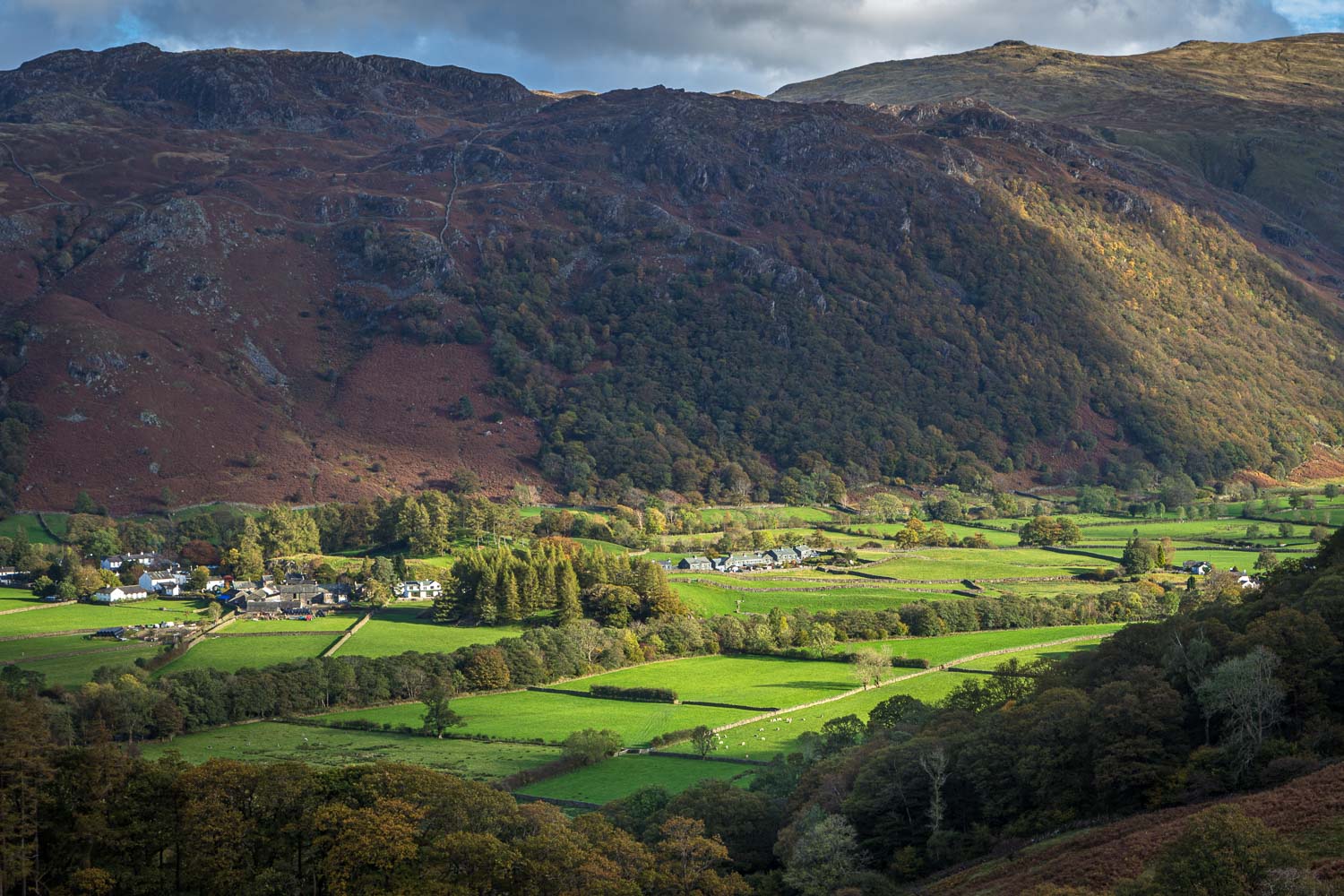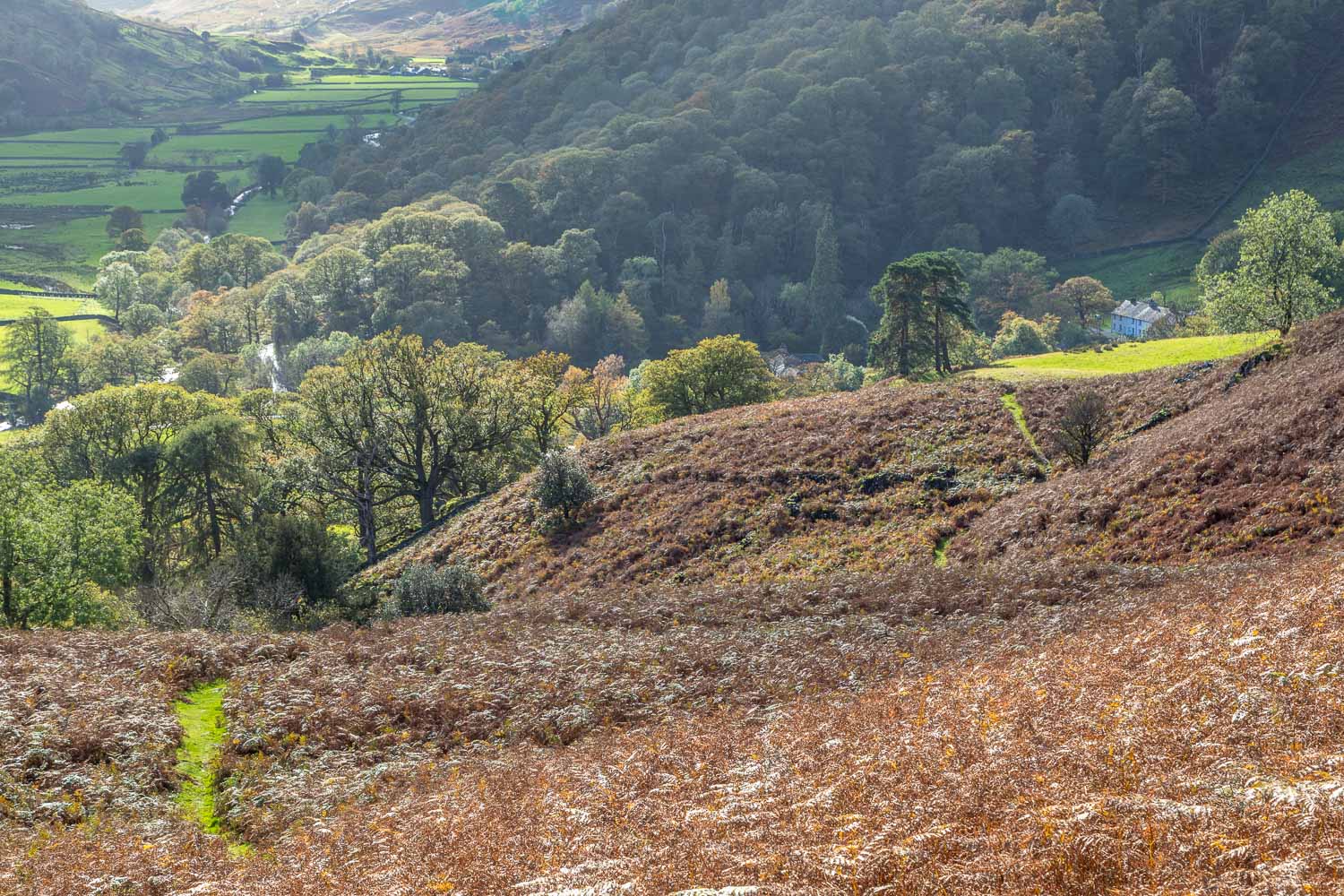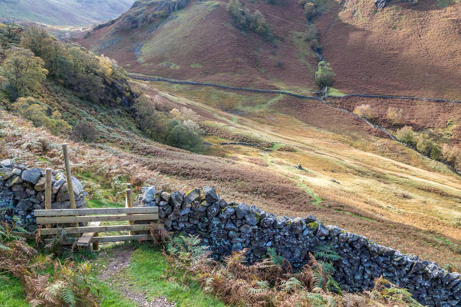 Beyond the river, the path continued to circuit around the edge of Johnny Wood, bringing us back to Seatoller just as the sun was starting to drop behind the fells