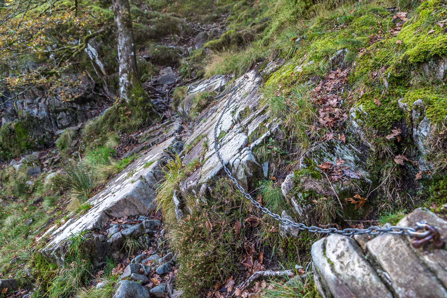 From here we retraced our steps for a short distance before turning off to the left and making the easy descent down into the valley via a grassy path down Lingy Bank. We arrived at the bank of the River Derwent and here joined the Cumbria Way for a short distance. The Cumbria Way turns east into Rosthwaite, but we continued along the western bank of the Derwent. There’s a rocky section near Glaramara YHA where chains are provided, but there are no dangers and progress would be safe without them