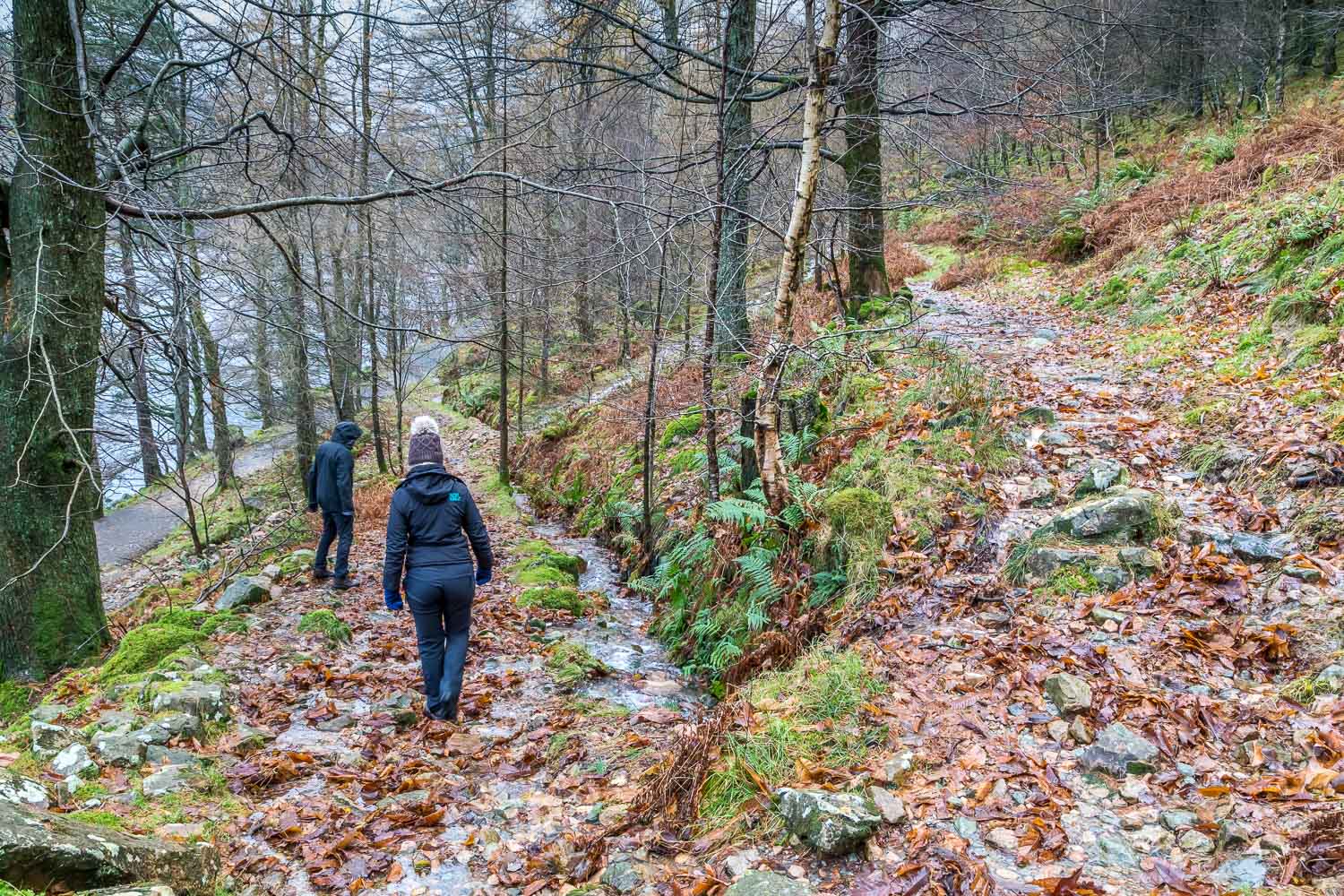 After driving gingerly along the inundated lanes we parked as usual in the National Trust car park at Long How which for once was deserted. We walked through Buttermere village and set off around the lake in an anti-clockwise direction out of force of habit. Sourmilk Gill waterfall at the foot of the lake was a raging torrent and part of the path nearby was underwater, so we took a slightly higher path to avoid this