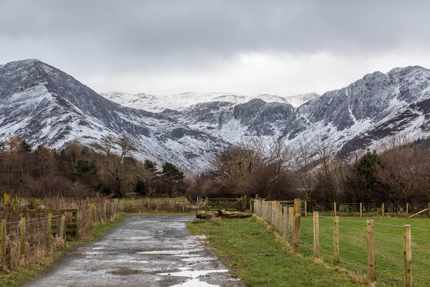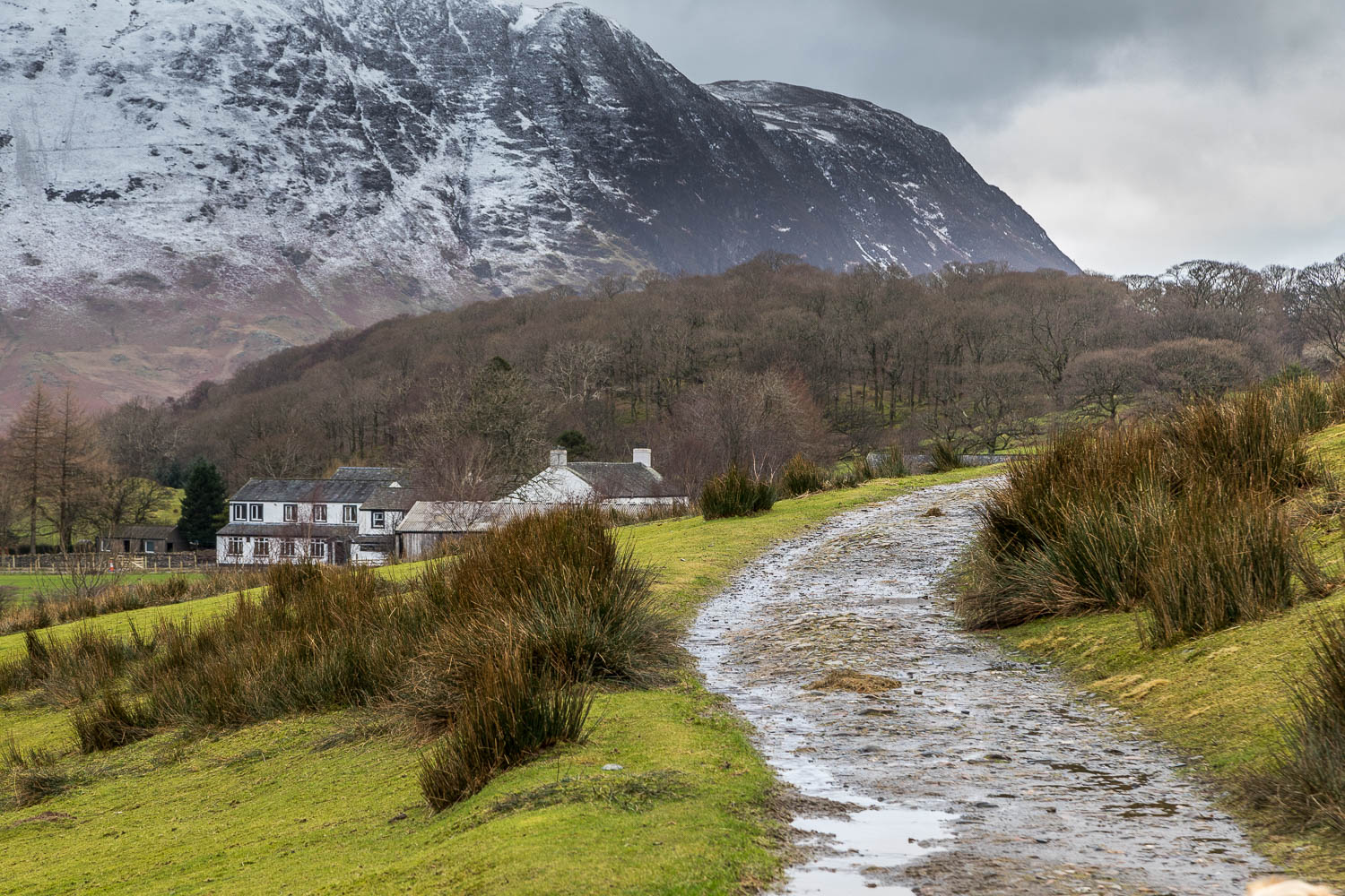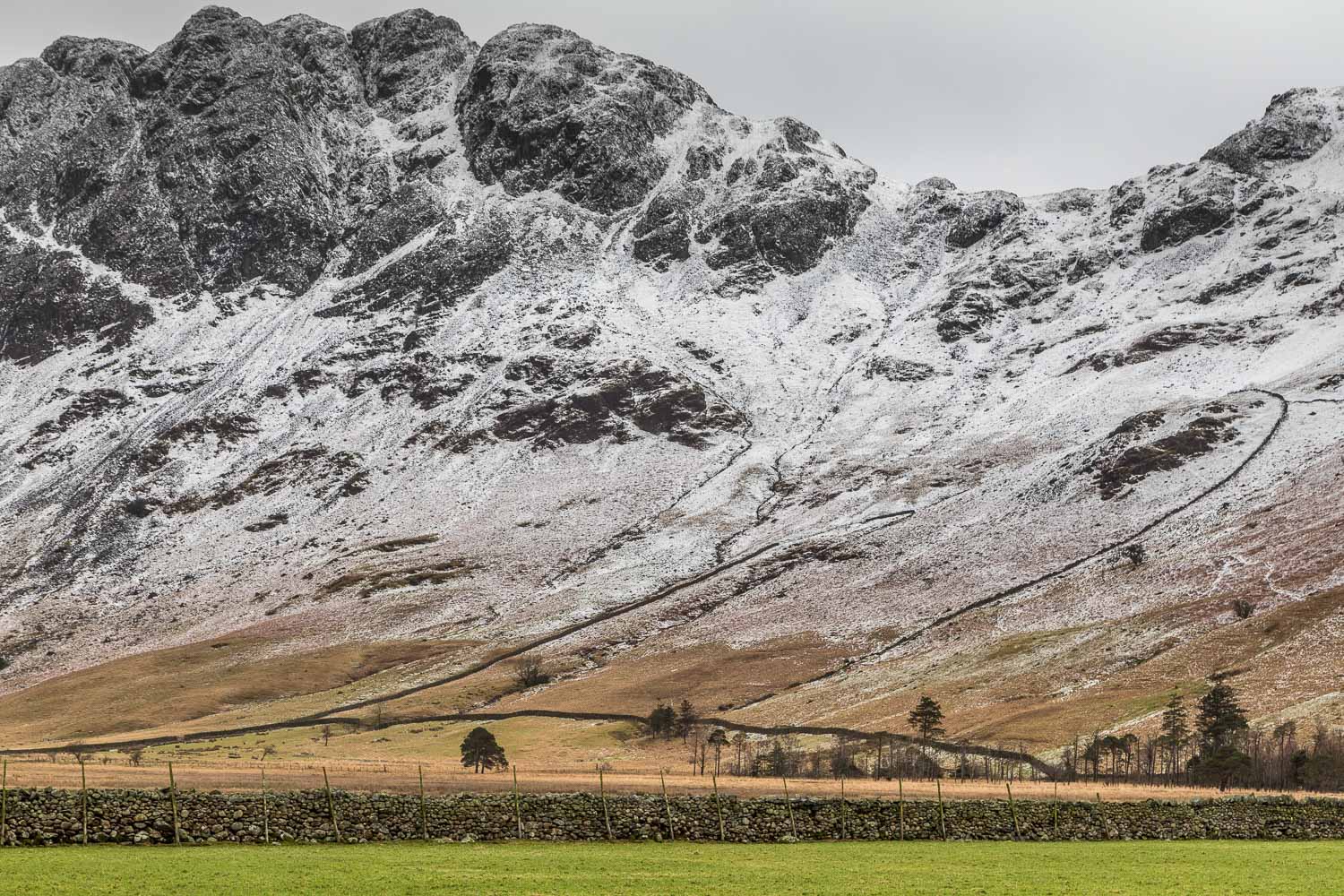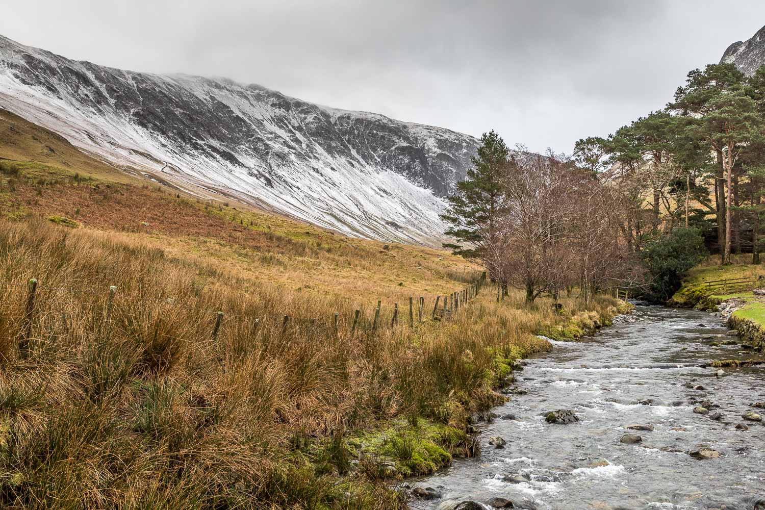 Overnight snow made road conditions difficult and in addition the Whinlatter Pass was closed today – not on account of the snow, but because badgers had undermined it. I therefore decided on a local walk, and Buttermere would fit the bill perfectly. This walk can be too popular at times but today the crowds would be deterred by the conditions, and this proved to be the case as I parked in an almost empty car park at Long How, just outside Buttermere village