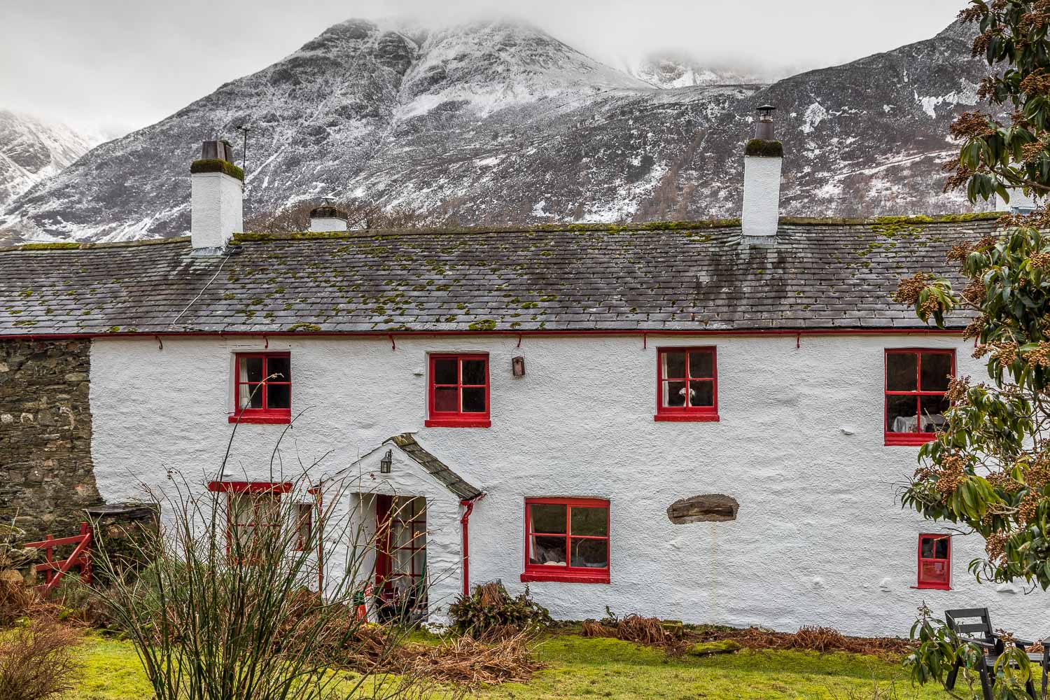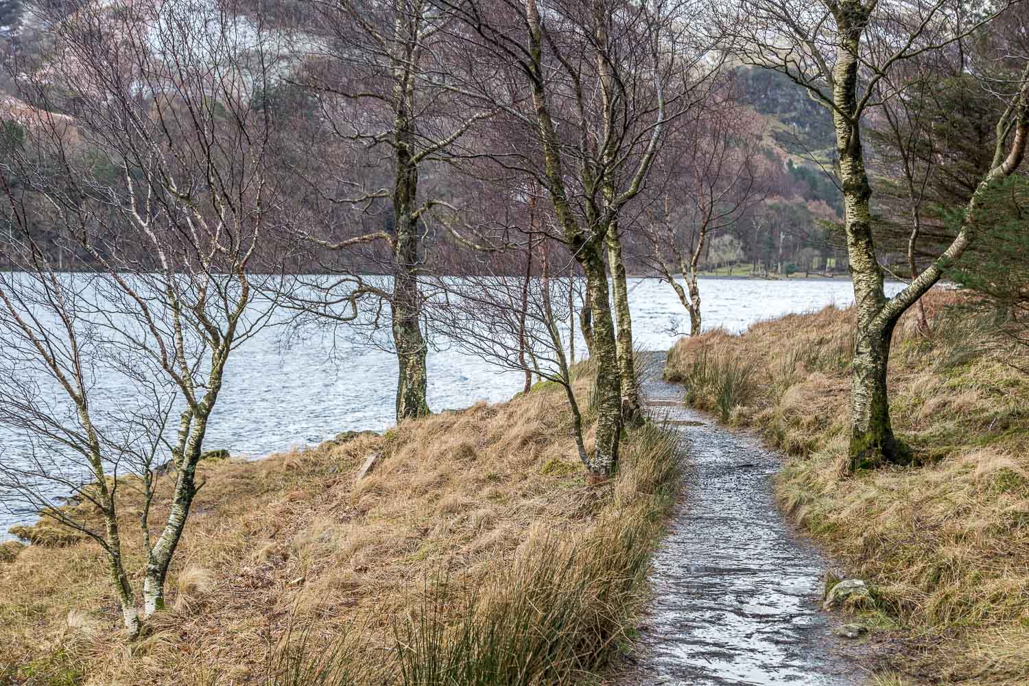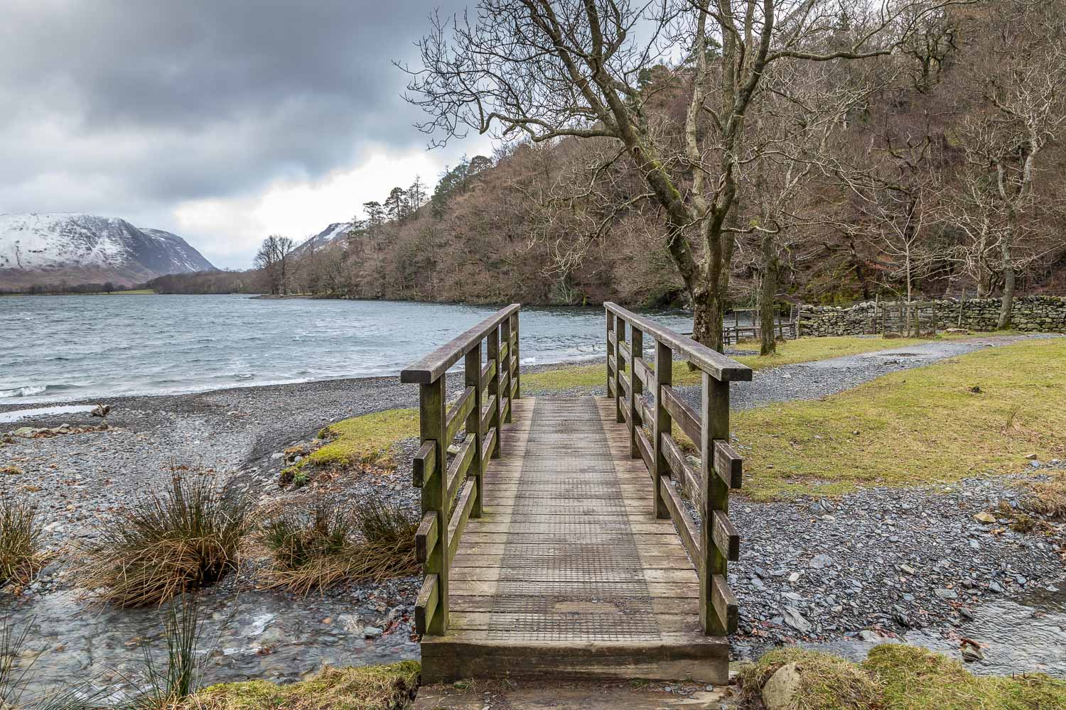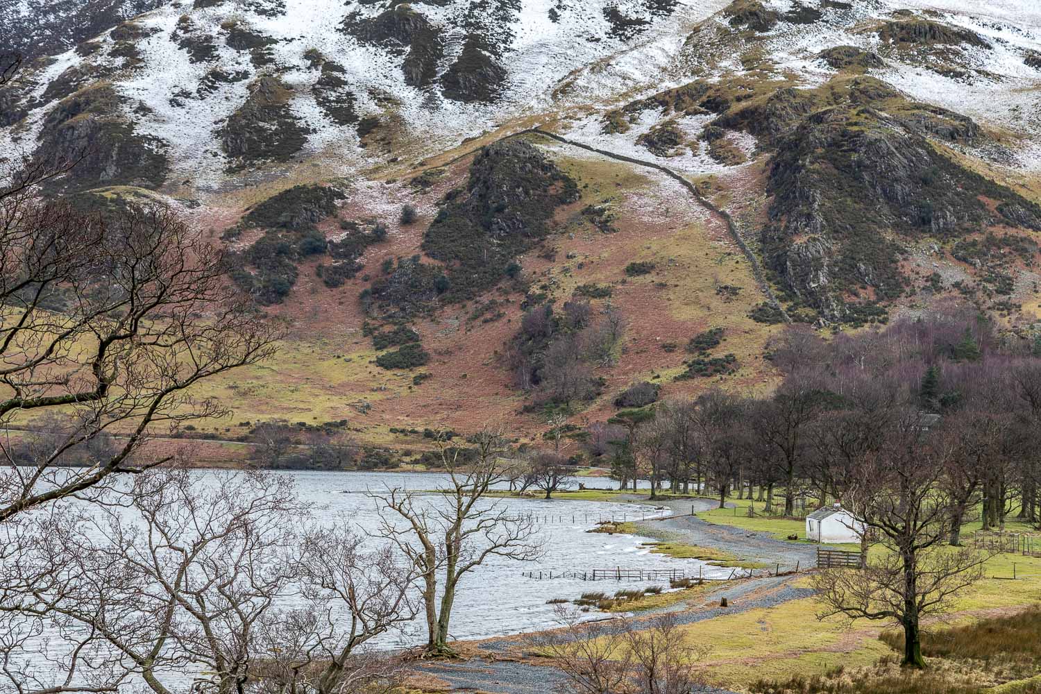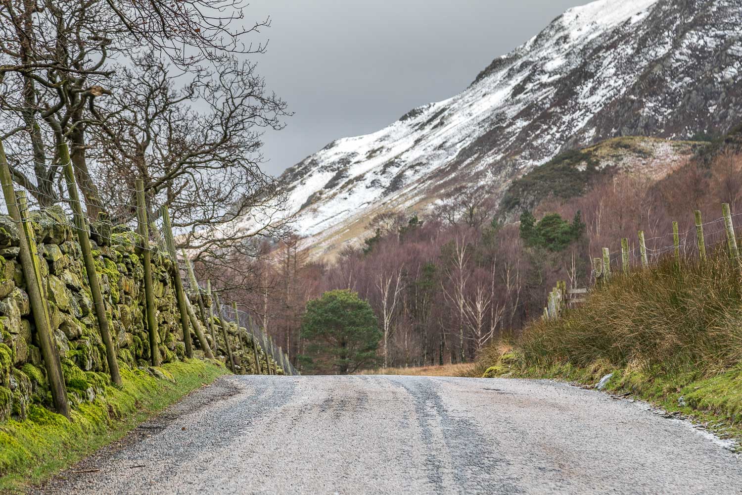 I emerged from Burtness Wood near the head of Buttermere, where the surrounding snow clad fells were looking very dramatic. I crossed Peggy’s Bridge and walked along the head of Buttermere, joining the road at Gatesgarth Farm. The Honister Pass was closed today and so I had the short roadside section before Hassness all to myself. I followed the rocky path along the lakeshore and through the tunnel back into Buttermere village to complete a circuit that never fails to please
