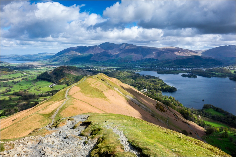 Looking back from the summit ridge to Bassenthwaite Lake and Derwent Water