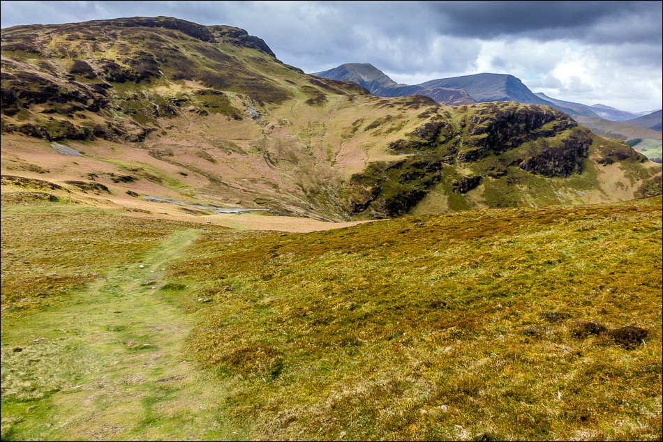 Looking back along the path, with the distinctive knobbly outline of Causey Pike beyond