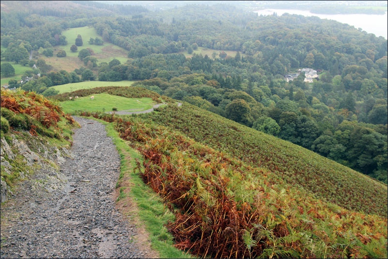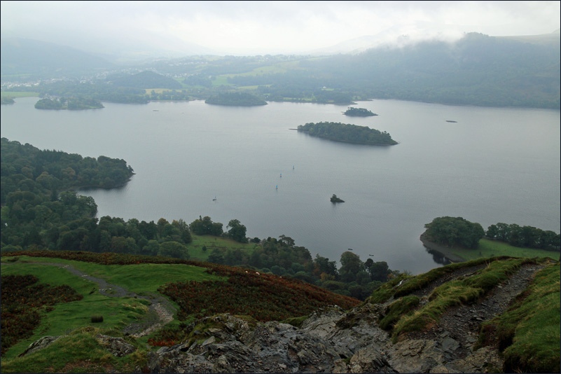 I arrived at the foot of Catbells and views of the lake soon opened out – not very well sadly, as it was misty with low cloud, but at least the rain had stopped by this point