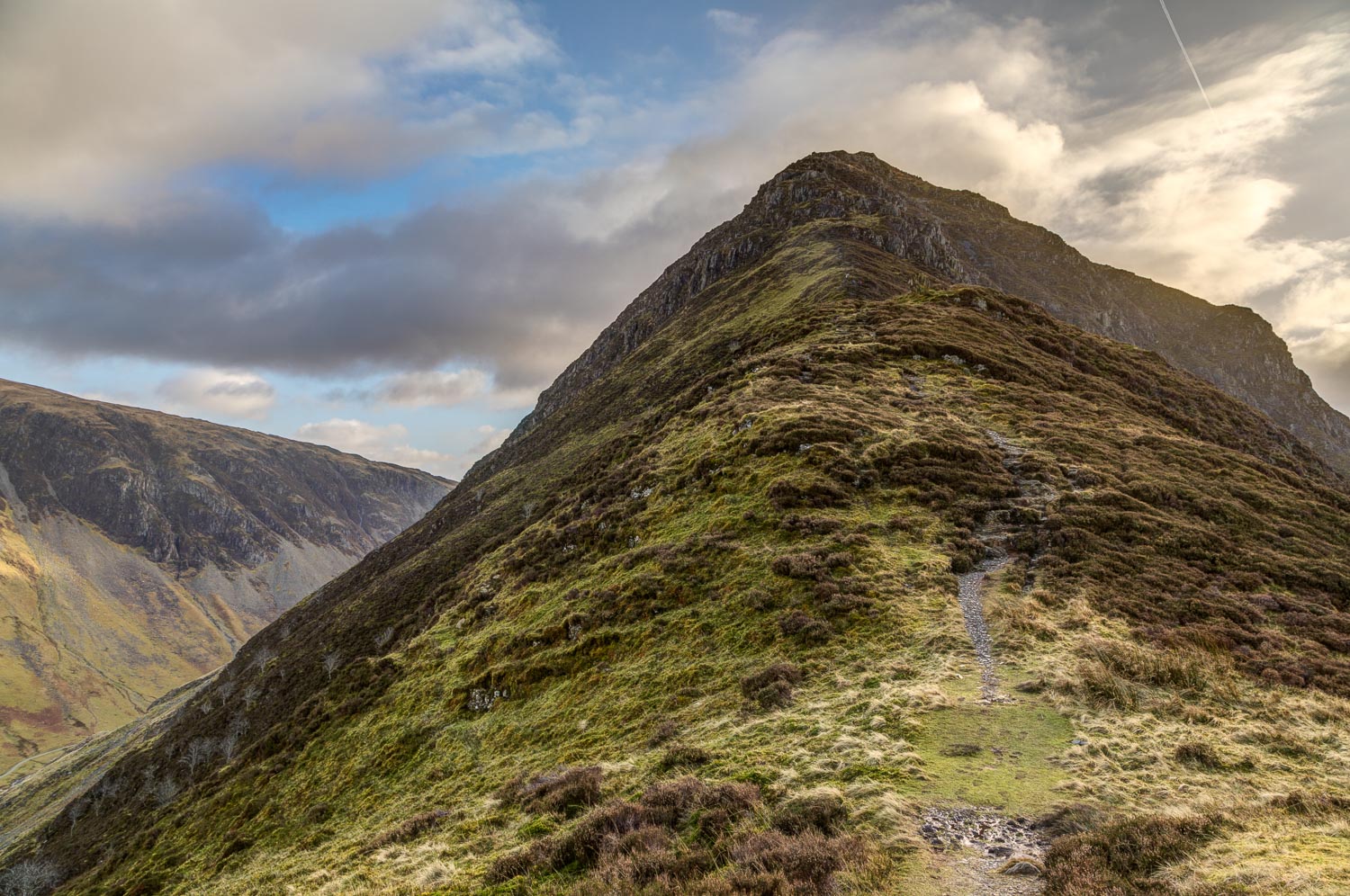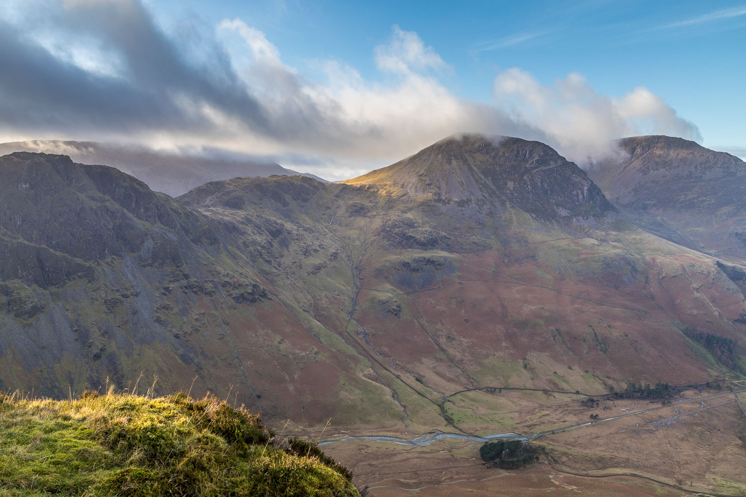 There’s only one place to start the ascent of Fleetwith Pike – from Gatesgarth at the foot of the fell. Accordingly I parked in the car park at Gatesgarth Farm (the fee is currently £4). I walked beside the Honister Pass road for a few yards before turning off to start the climb up Fleetwith Pike. It’s a relentlesss climb up Low Raven Crag, along Fleetwith Edge and thence to the summit. The ridge looks alarming seen from below, and while there are several steep sections where hands are needed, there’s nothing to frighten the horses – it’s a delightful climb. The enjoyment of the ascent is enhanced by the wonderful retrospective views over Buttermere and Crummock Water