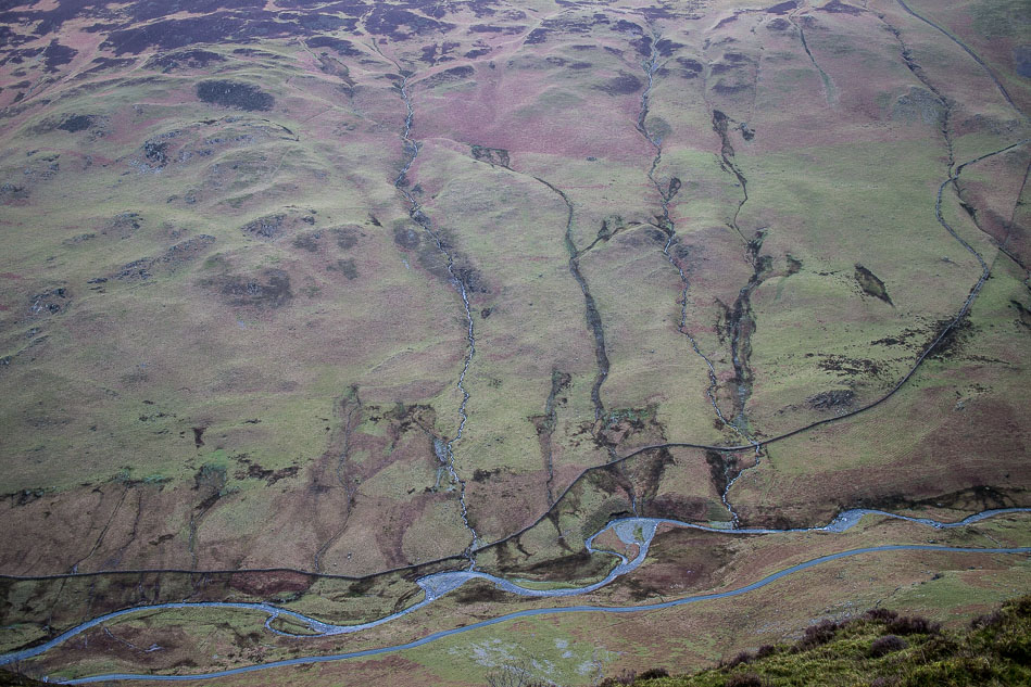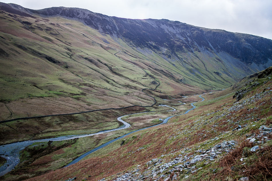 Gatesgarthdale Beck and the Honister Pass below