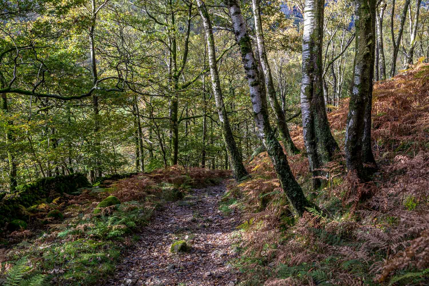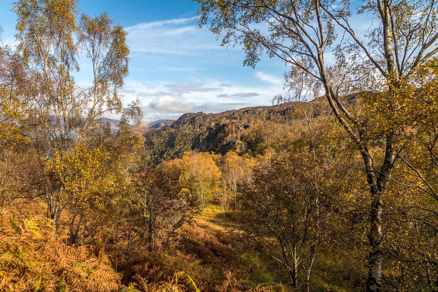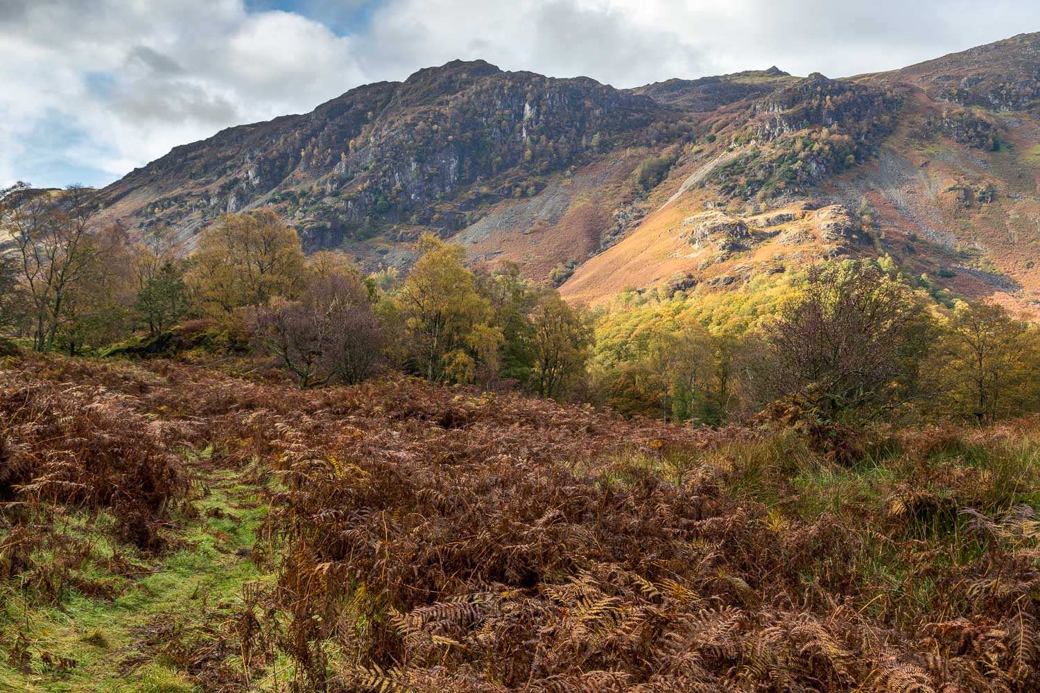 Autumn is well underway, and I wanted to visit an area where there is good woodland colour at this time of the year. Another visit to Borrowdale, home to some ancient deciduous woods, would fit the bill perfectly. I parked in the National Trust Bowderstone car park and from here followed a path which goes through beautiful woodland, gradually curving around the steep crags above – a direct assault on the fell would be impossible for ordinary walkers