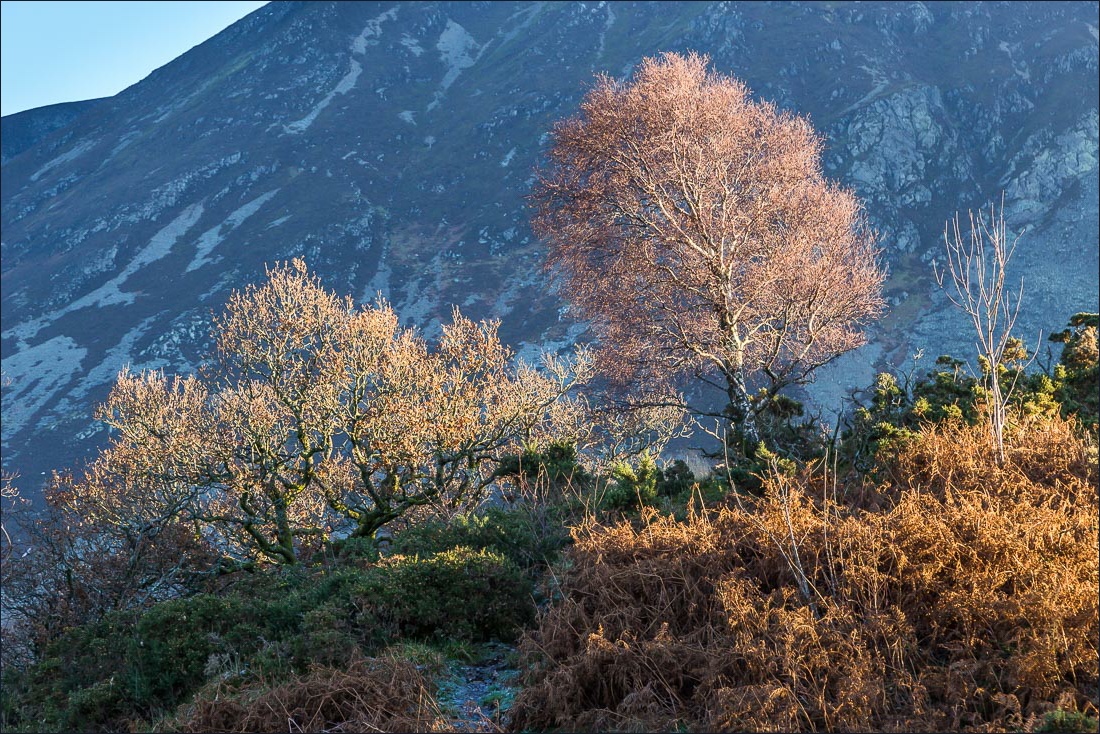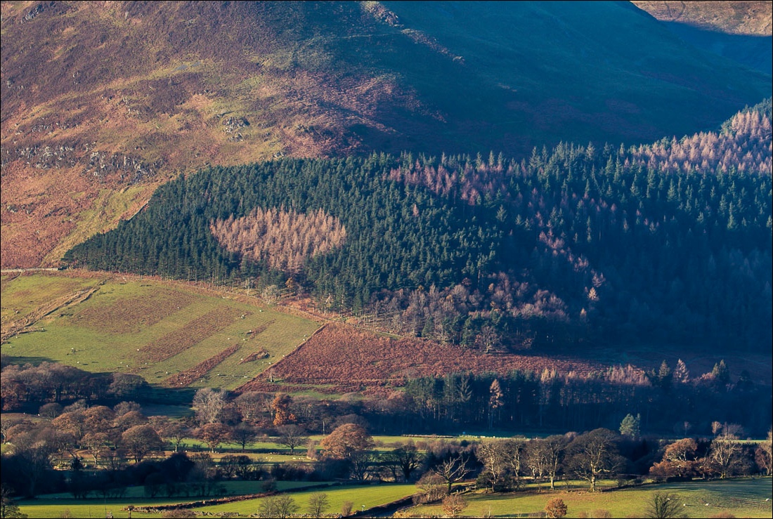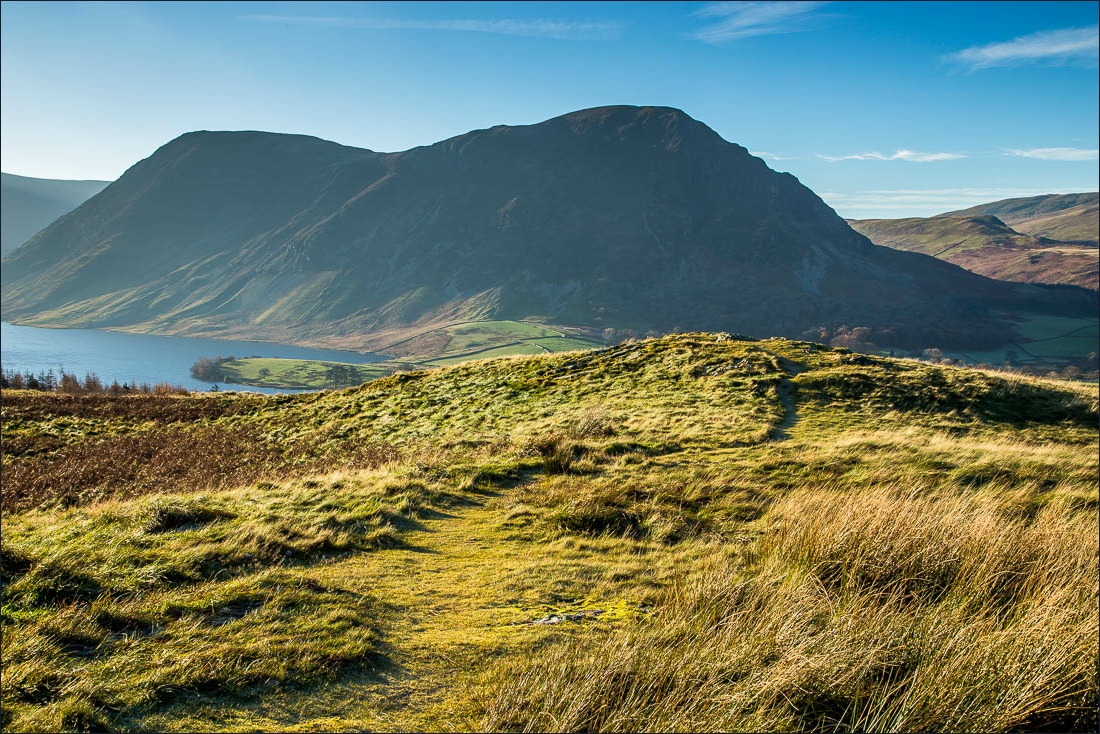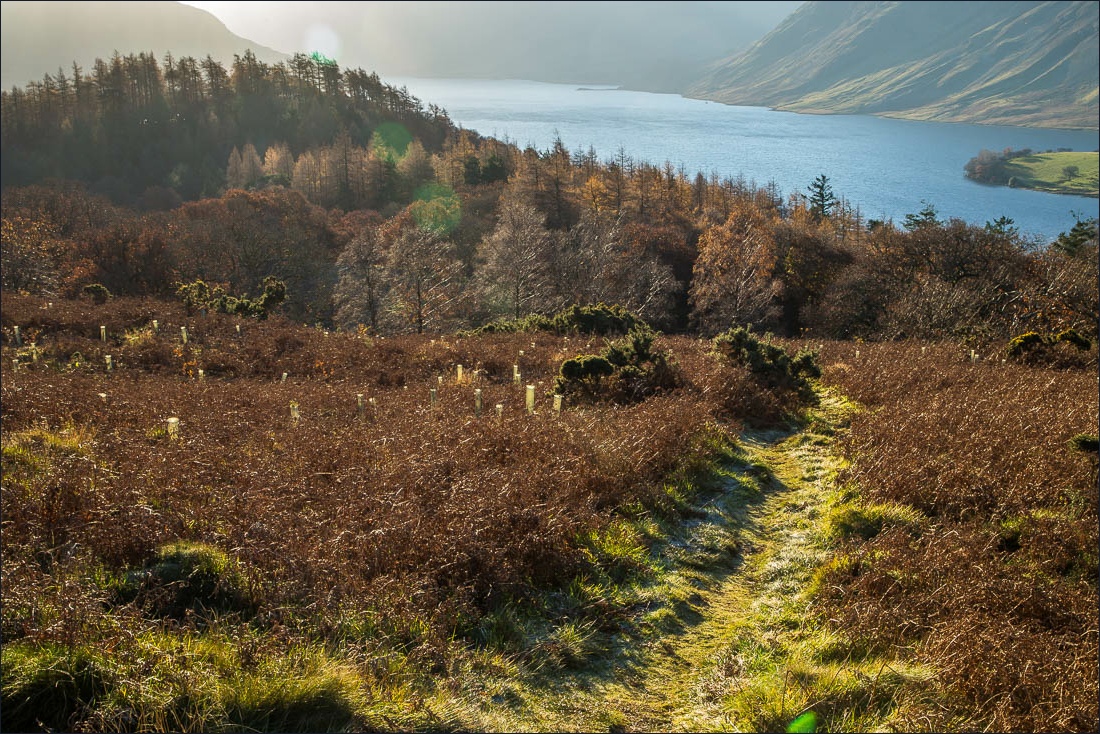 From the car park we climbed steeply uphill to the top of Lanthwaite Hill, shown on the OS map as Brackenthwaite Hows. This is one of my favourite places in lakeland. Although the hill is a small one it has extensive and very beautiful views over a large chunk of the Western Lake District, including Lorton Vale, Loweswater, Crummock Water and many of the western lakeland fells. After admiring these for a few minutes we descended into Lanthwaite Wood, skirting around its edge before walking down to the shore of Crummock Water