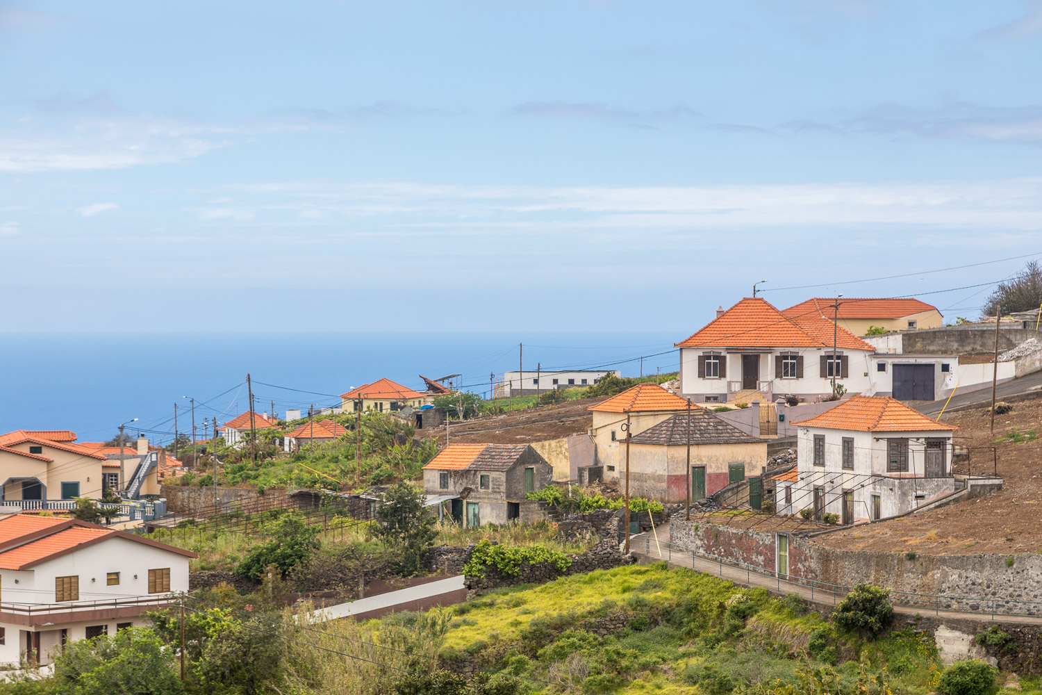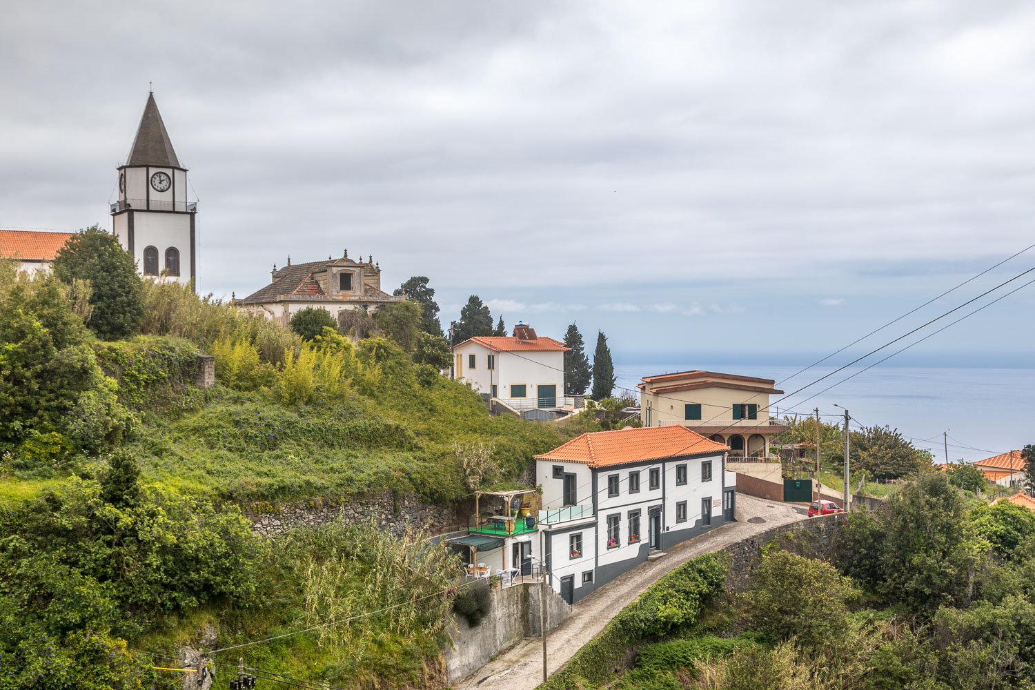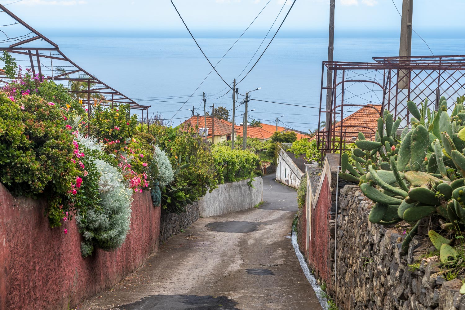 Eventually we reached a small house with a water garden feature. The Levada Nova continues its journey, but this was the end of the levada section for us. We descended quite steeply down a narrow concrete lane Caminho dos Moinhos which took us into Estreito da Calheta. The route shown on the map ends at the village church, and for us it was a short stroll back to our hotel and the end of a superb walk