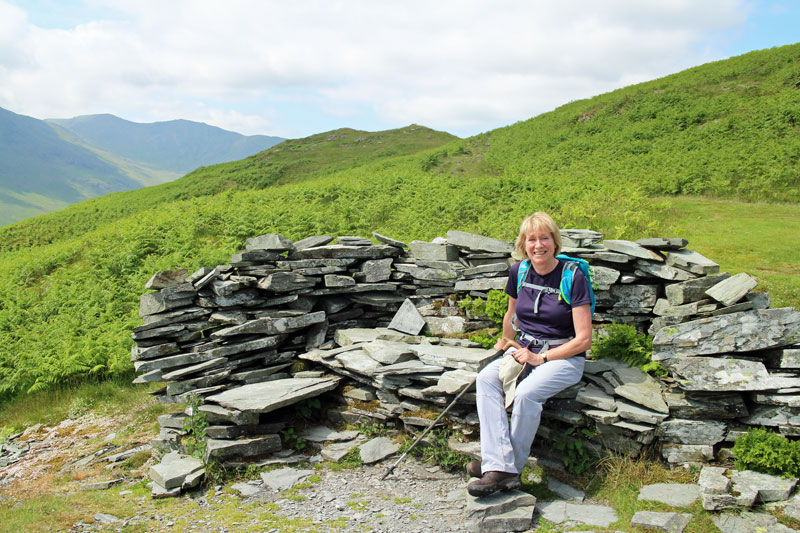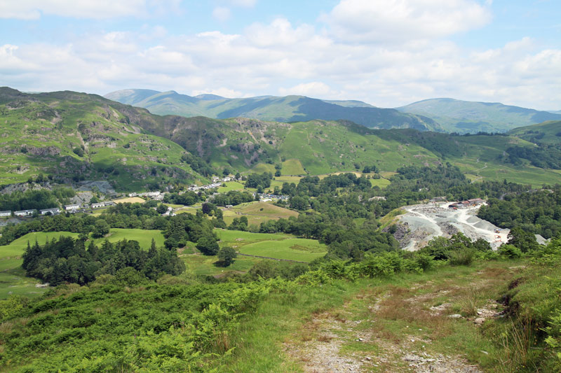 We parked at Elterwater and crossed the bridge to start the climb up to Lingmoor Fell. The weather was hot – about 23c – and we were soon puffing and panting
