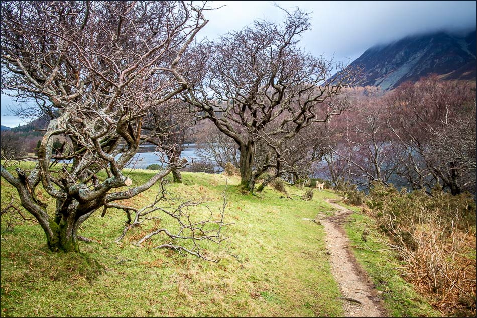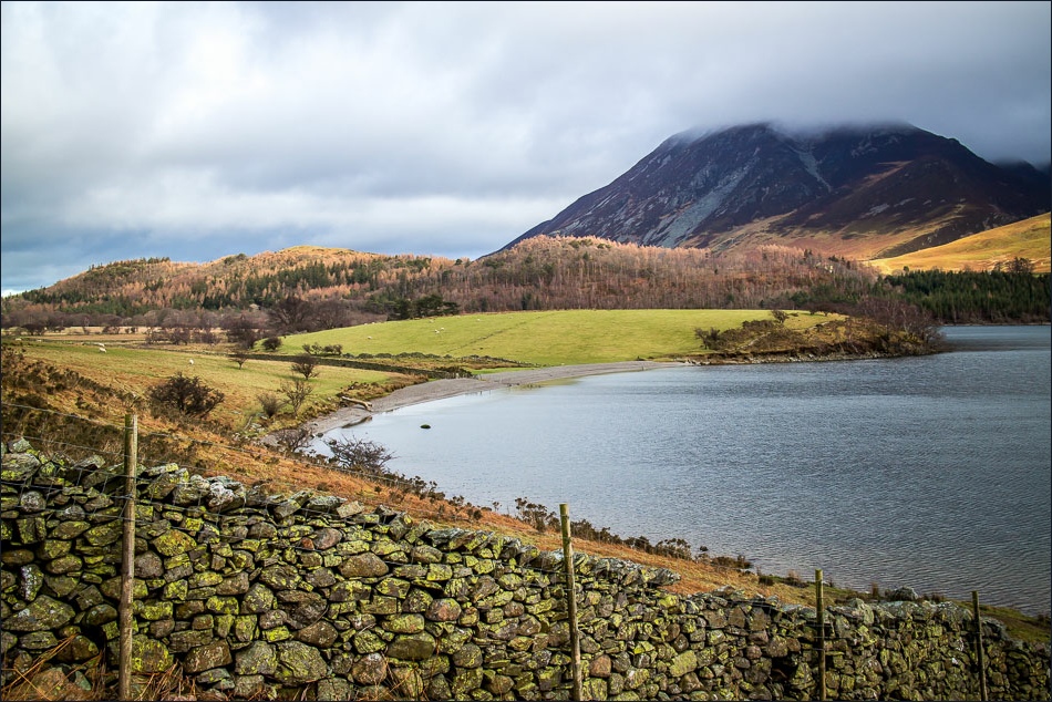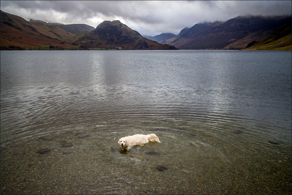 We parked at Park Bridge near Loweswater (there’s only space for two cars at most) and walked past Flass Wood under the foot of Mellbreak and down to the west shore of Crummock Water. The sight of the lake gave old Meg a new lease of life and she was bounding around like a puppy as we threw sticks into the water for her to retrieve
