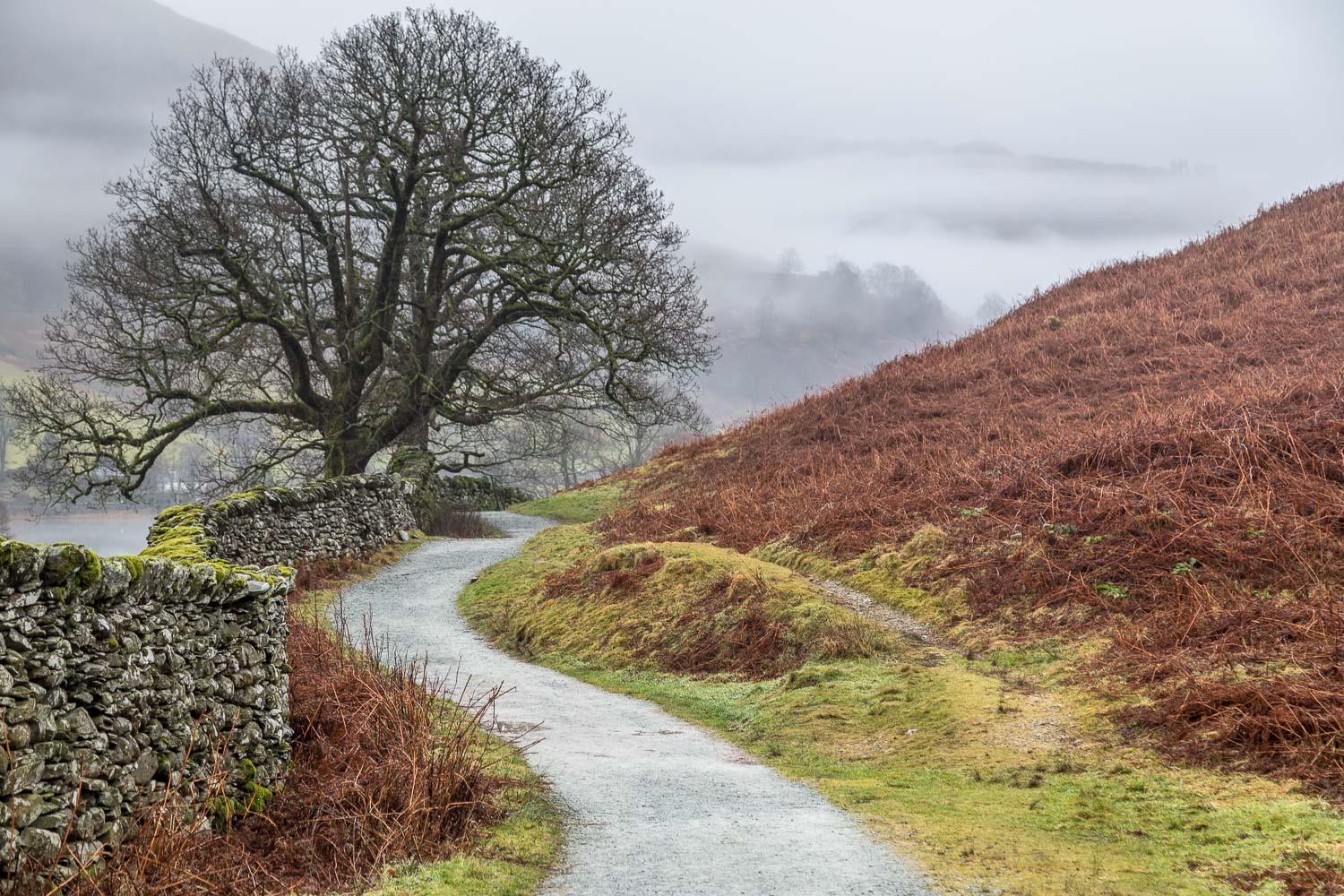 I decided instead to walk round Rydal Water which looked quite atmospheric as I drove by. I parked on the roadside at Rydal Mount and followed the footpath beside the A591. I’d normally have followed the higher level Coffin Road which avoids the road and has good views but there would have been no point in doing so today. It’s possible to leave the footpath in a couple of places and descend to the lakeshore