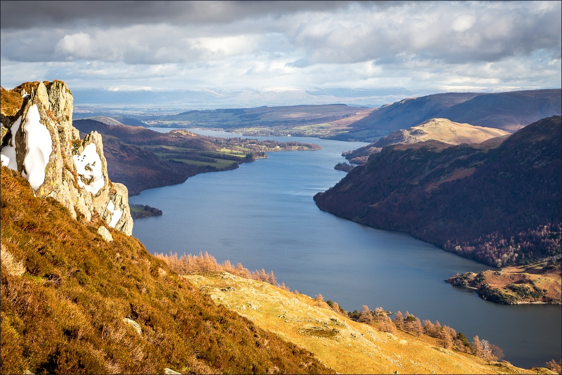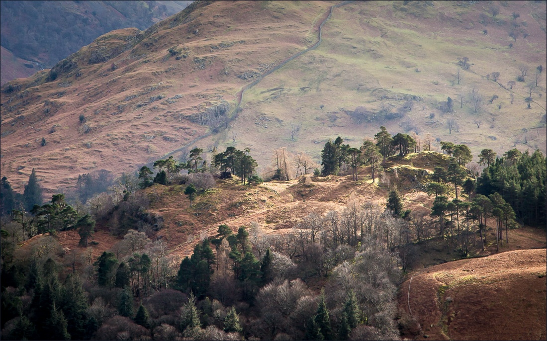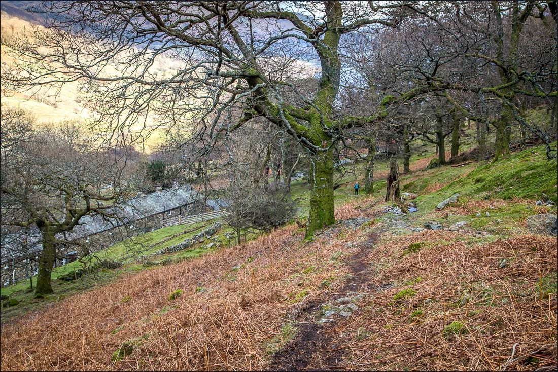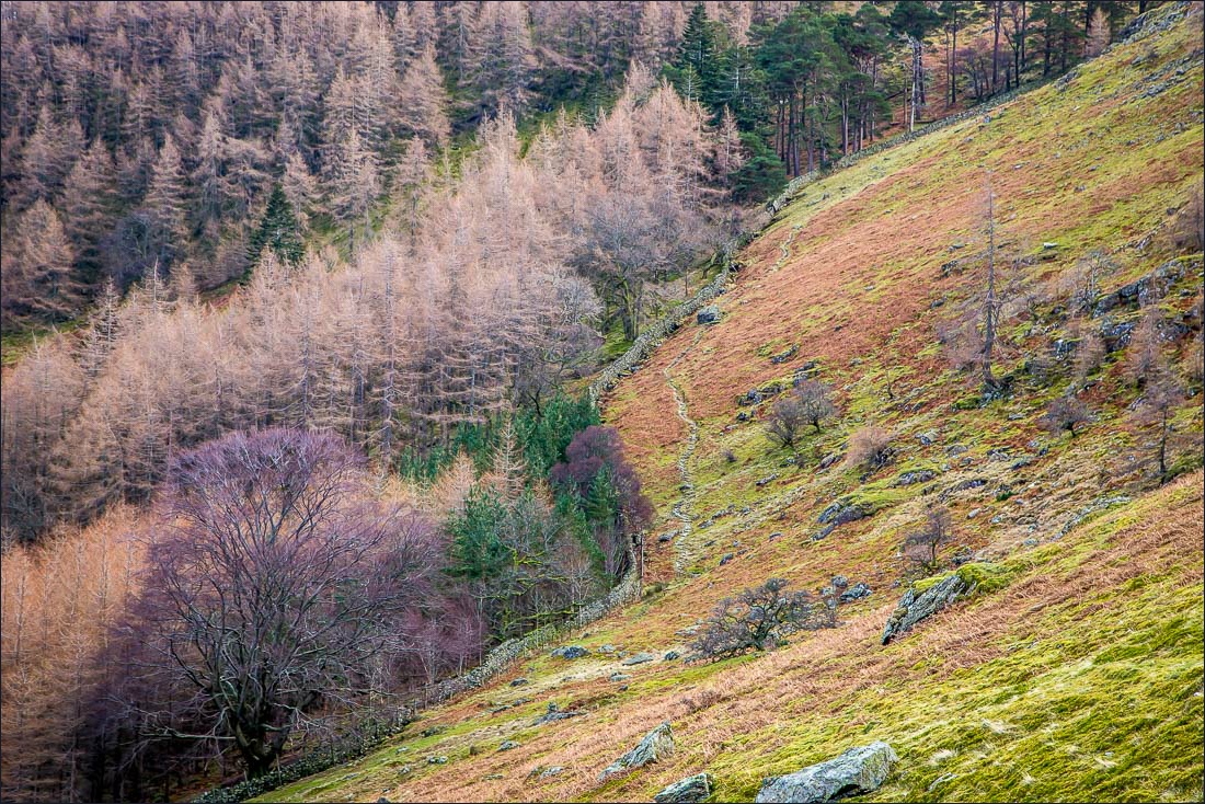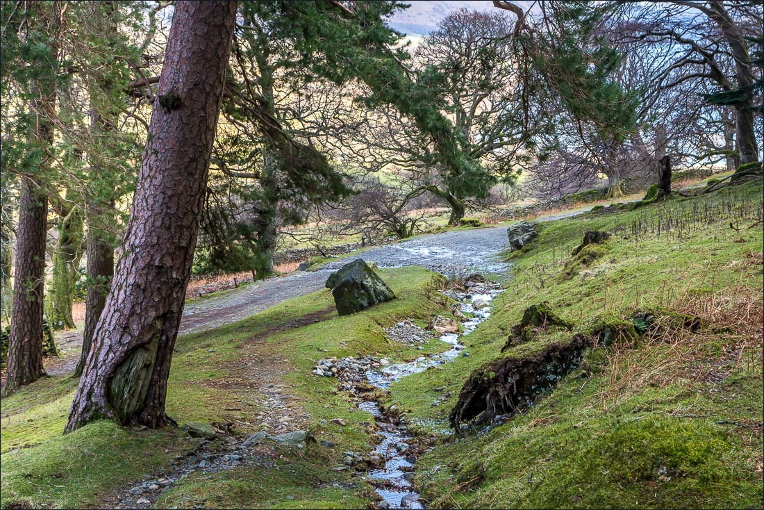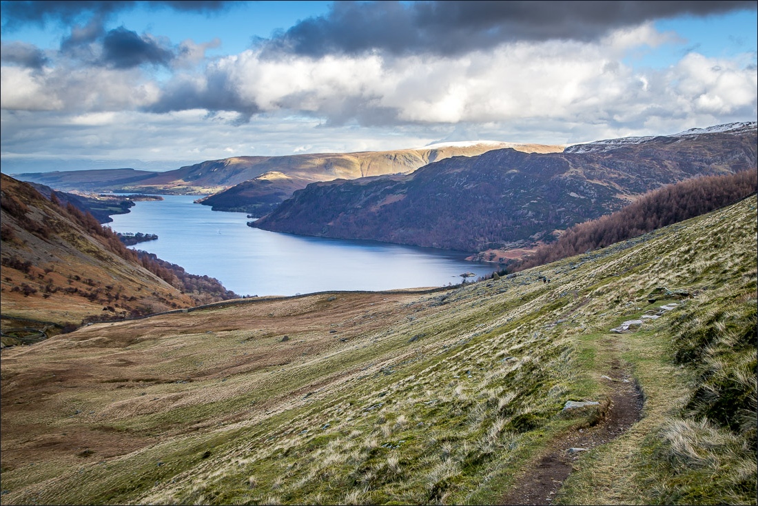 The initial part of the descent into Glencoyne proved to be very tricky and extreme care was needed. The narrow path runs at high level round the flanks of the fell and was covered in hard snow and sheet ice. Eventually we descended below the snow line and were able to make quicker progress along Glencoyne – a beautiful section of the walk