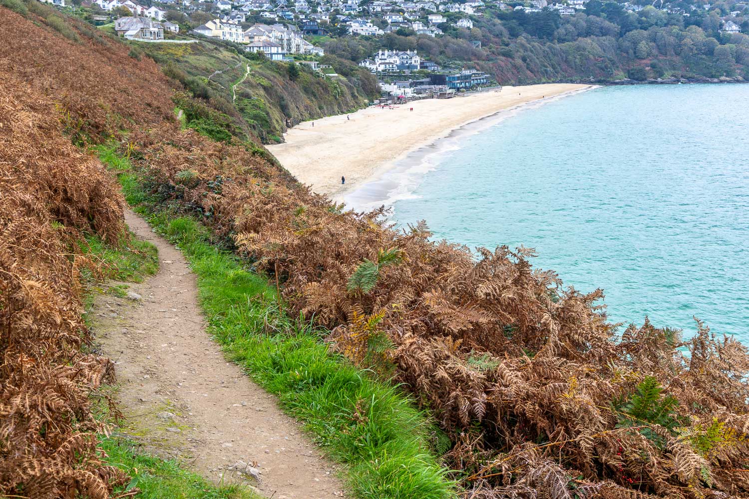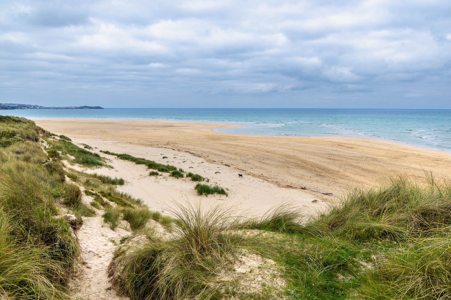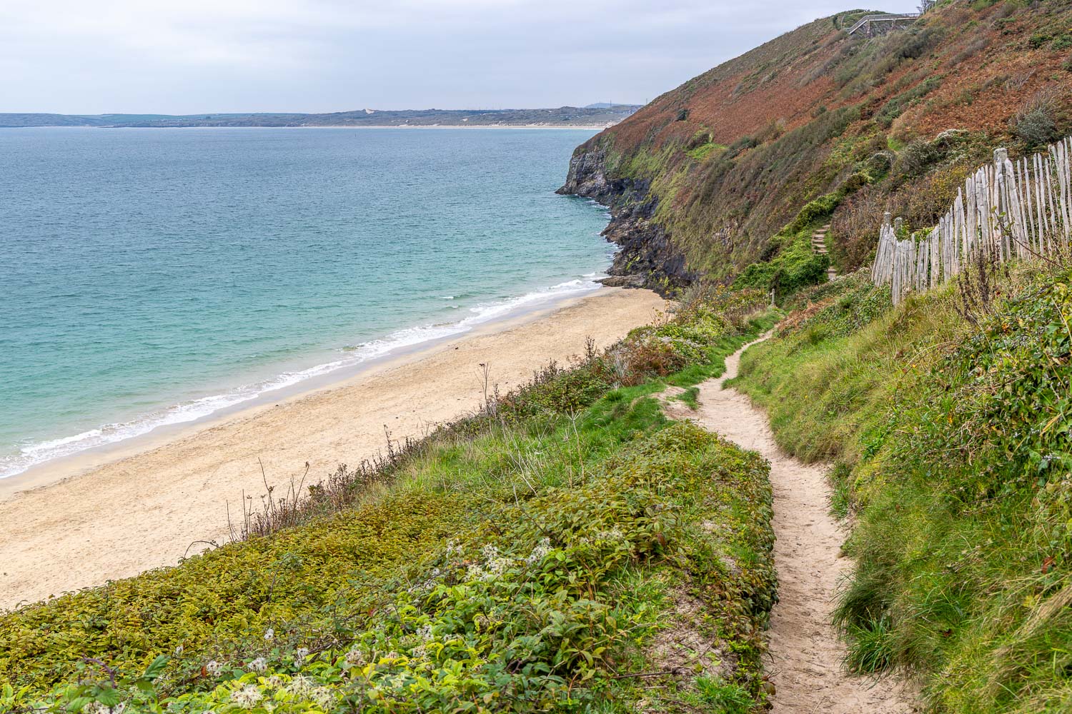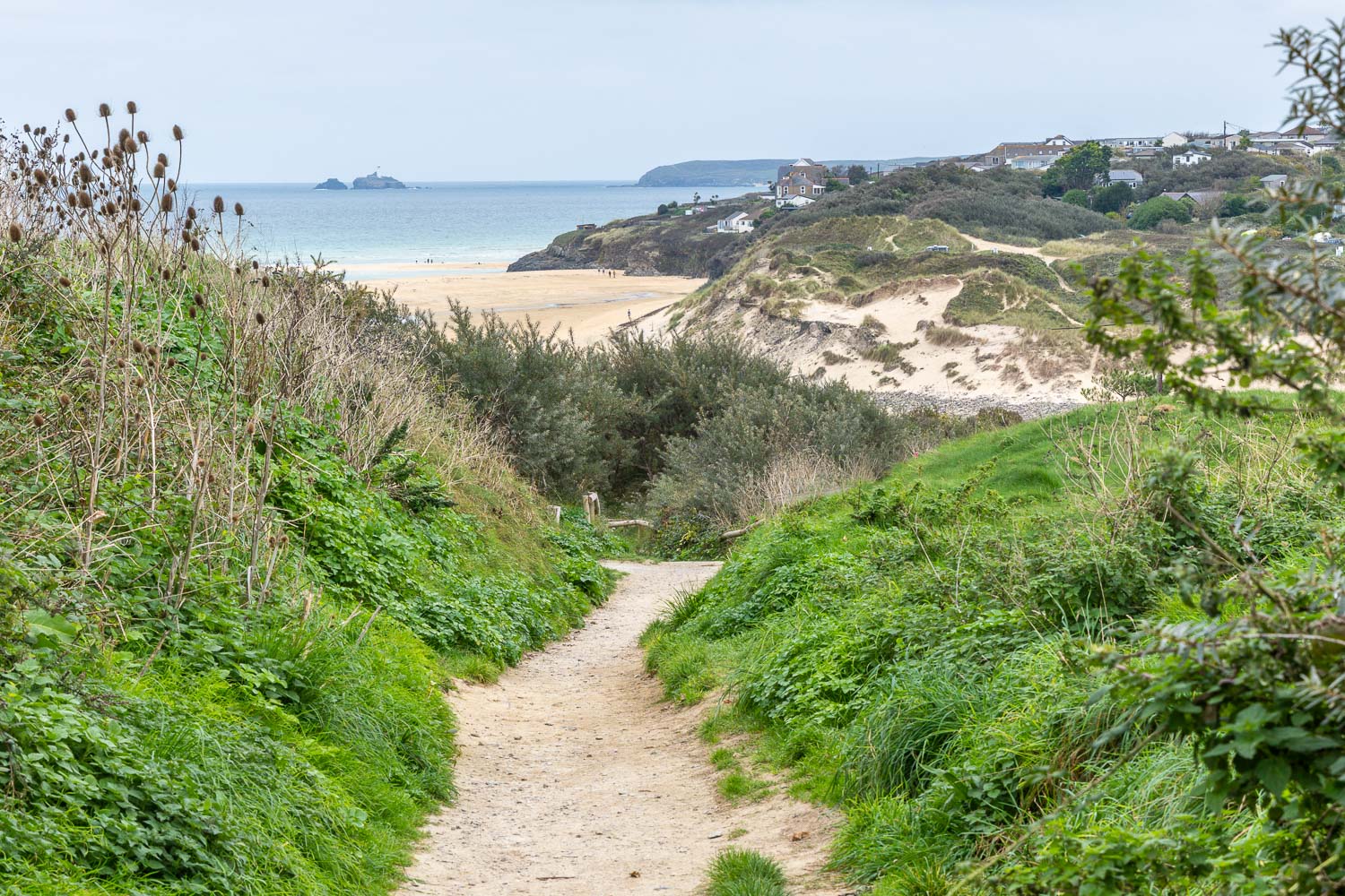 The headland of Carrack Gladden prevents further access along the beach, so we climb back up the dunes to regain the official path.
