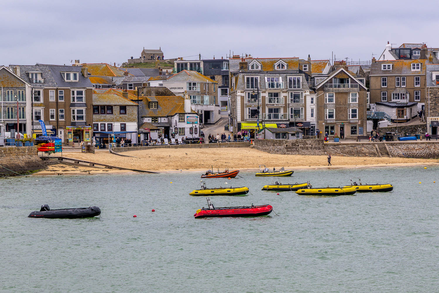 After walking around the headland we arrived at the sandy beach of Carbis Bay, overlooked by a very large hotel and numerous expensive looking houses. Beyond Carbis Bay our destination, St Ives, came into view. The walk could be ended at the railway station and shortened to about 4.5 miles. We preferred instead to explore St Ives and so continued beside its beaches and harbour as far as St Ives Head. We turned back here and returned to the start through narrow winding streets full of small independent shops and art galleries