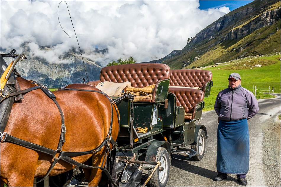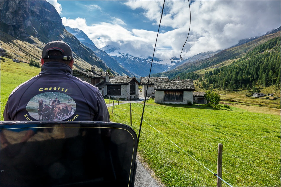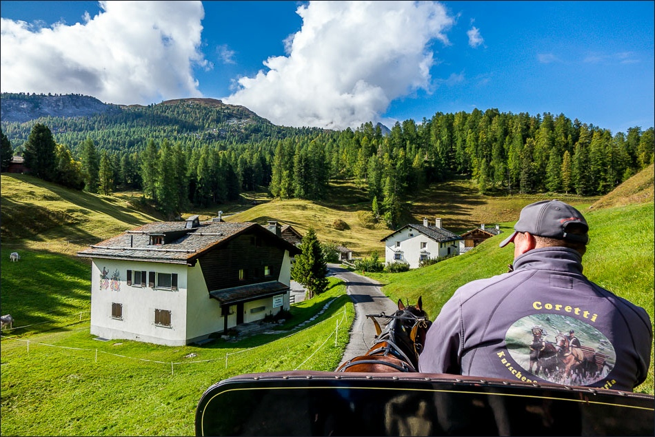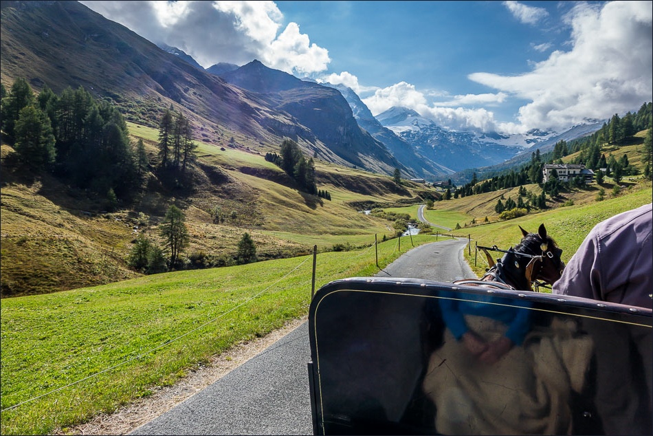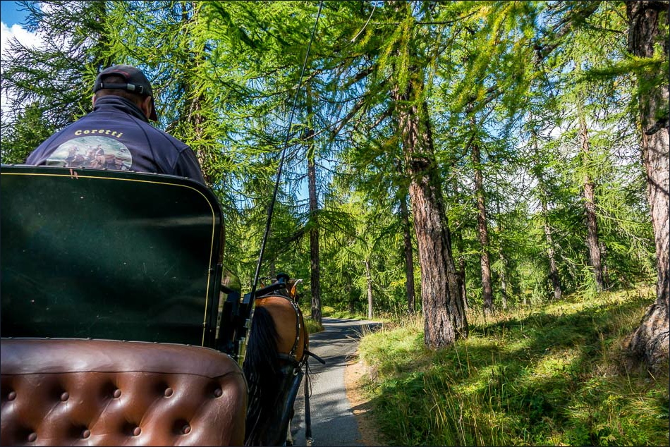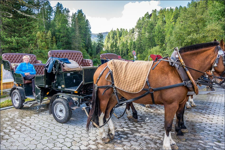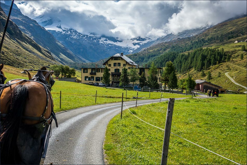 We took the bus from outside our hotel in Pontresina and after a 40 minute journey through beautiful landscape we disembarked in the pretty village of Sils Maria. We walked over to the village square where, just as we’d hoped, there were several horse drawn carriages ready and waiting. We hired a driver to take us to the Hotel Fex, which is as far up the valley as the carriages go