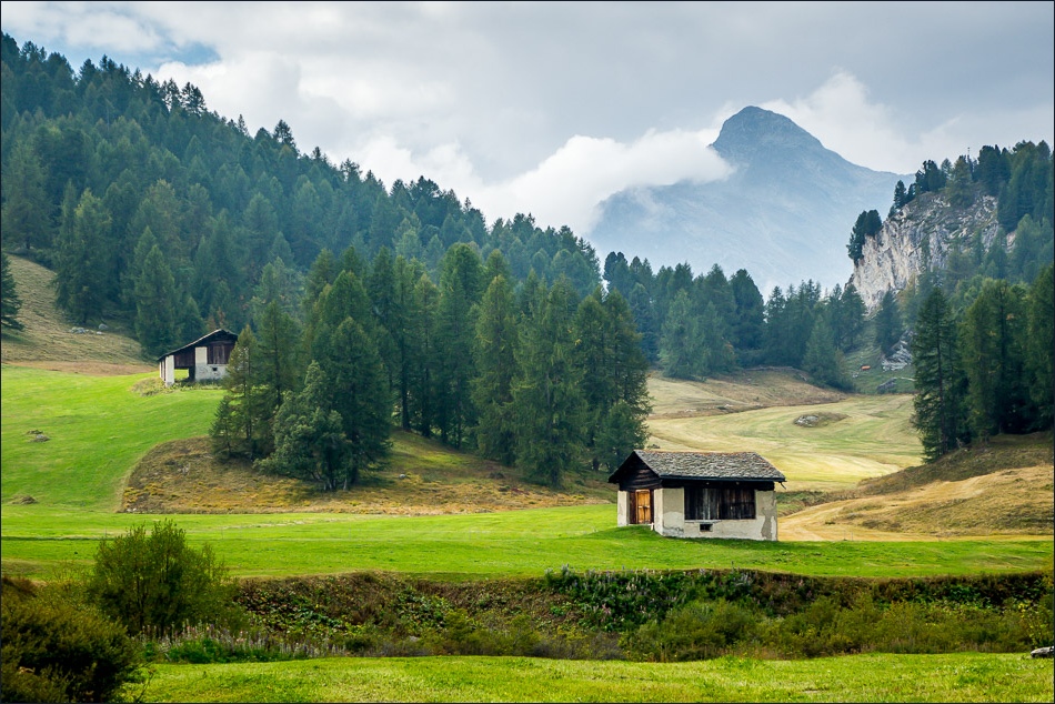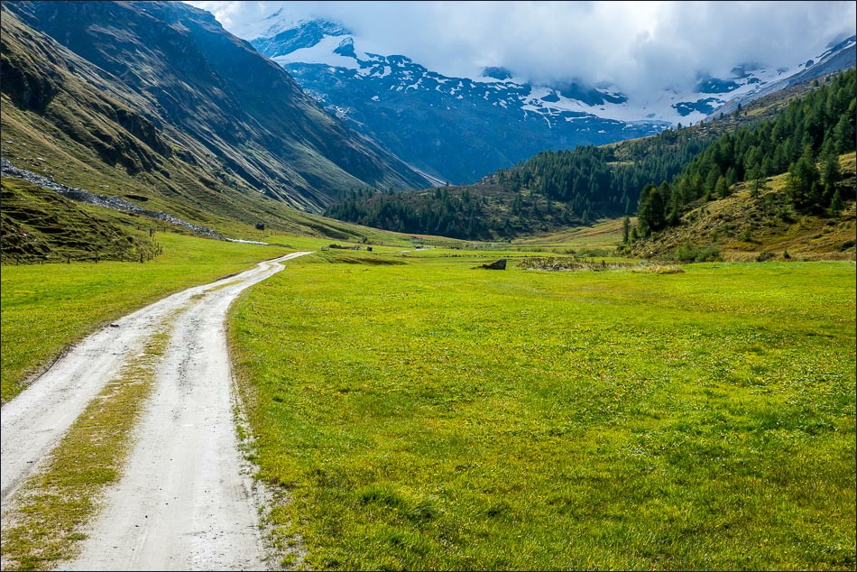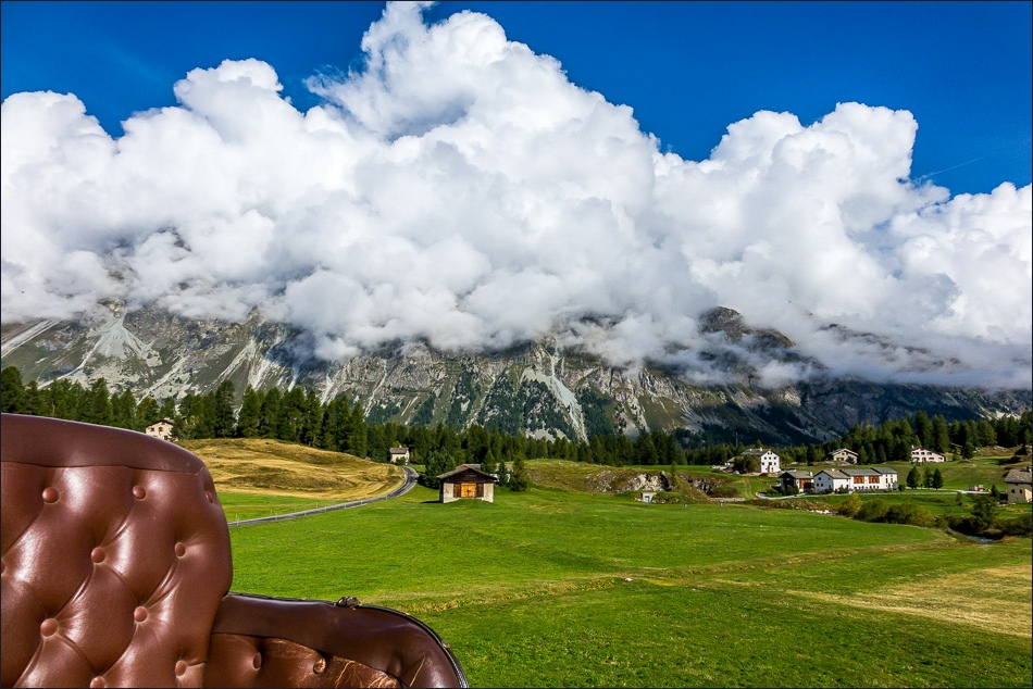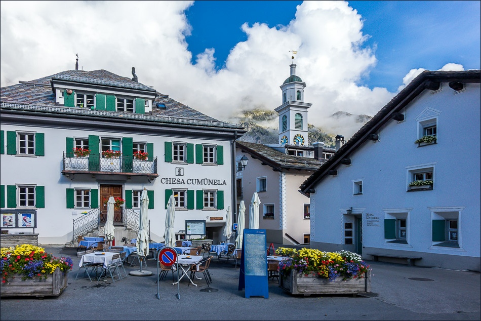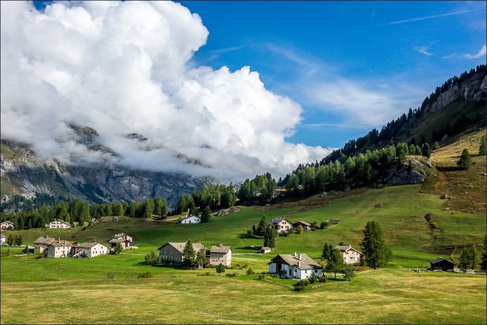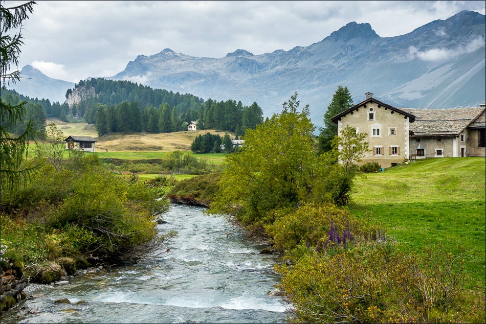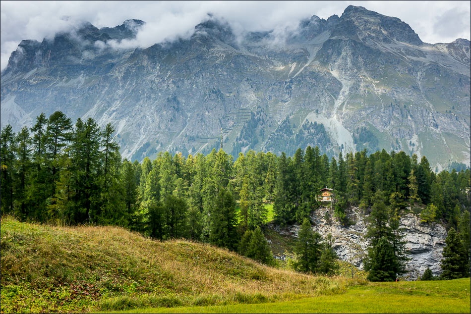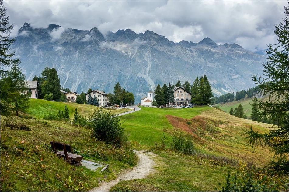 It was an enchanting ride through alpine meadows and small villages with mountains towering over us on all sides. When we reached the hotel we continued on foot to the end of Val Fex at Alp Muot Selvas, then returned along the valley on a higher level path