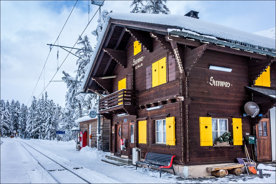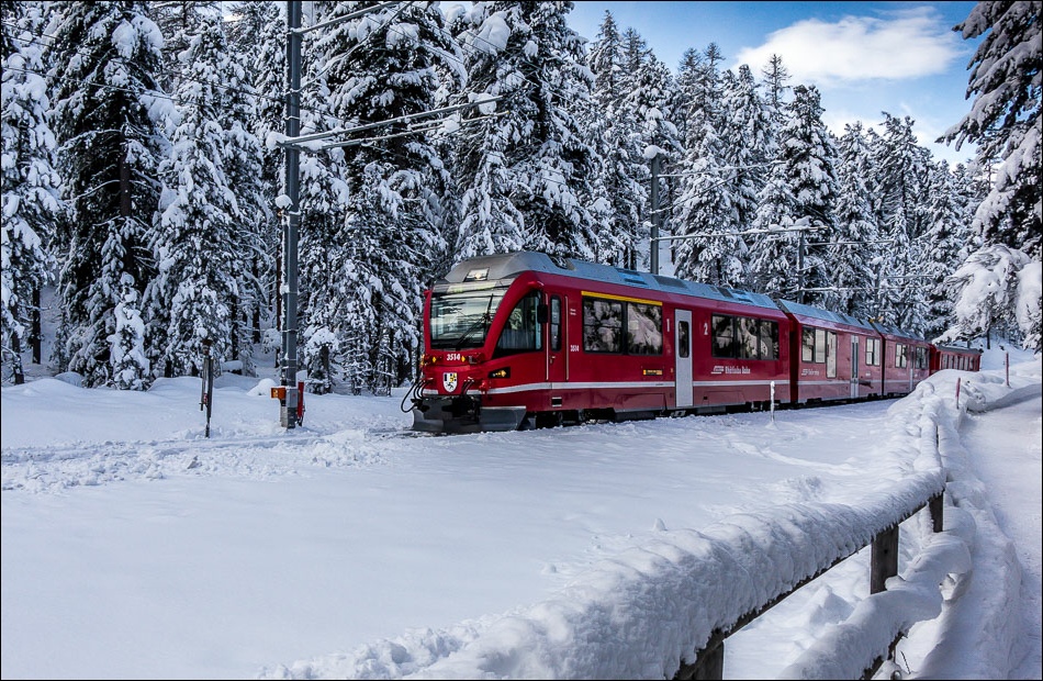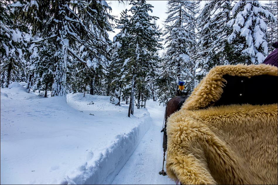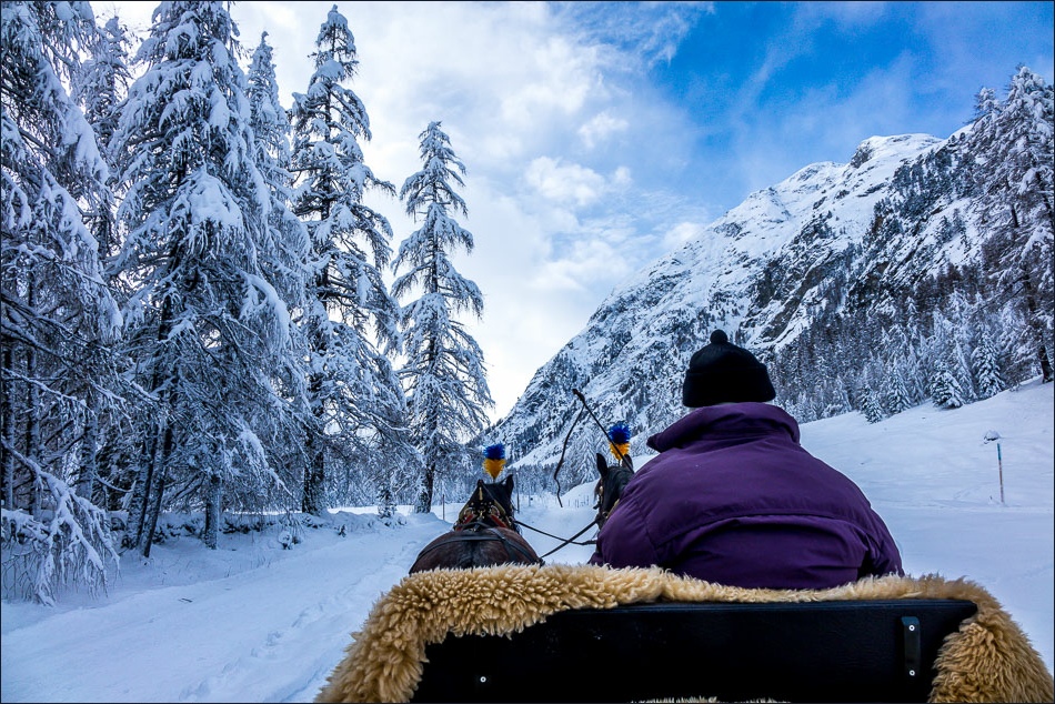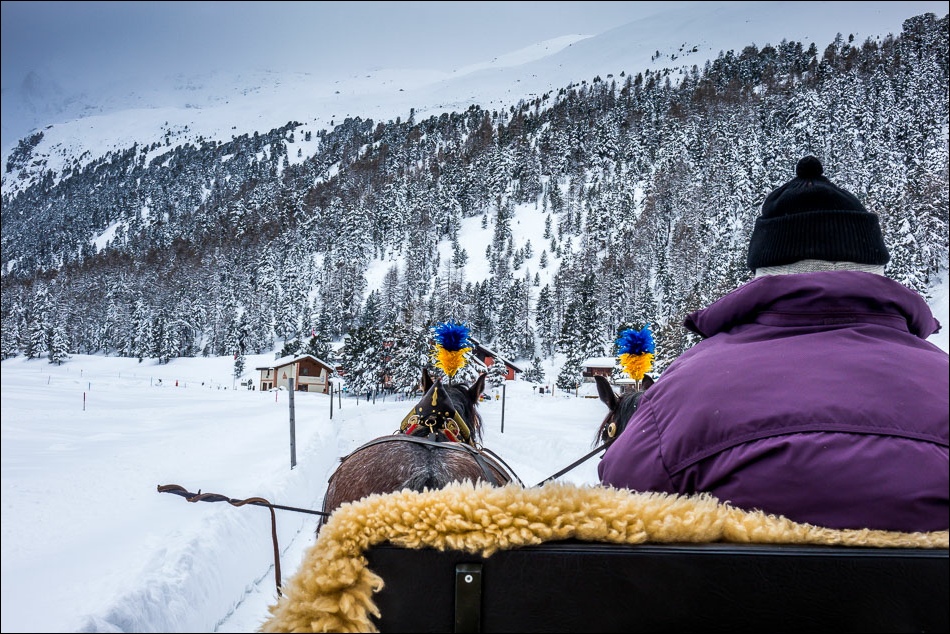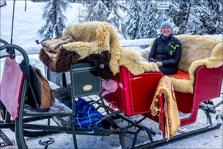 We walked from our hotel to the departure point near the main railway station in Pontresina, and just as arranged our sleigh arrived. Our driver Conrad draped us with thick blankets (which were needed, as it was below freezing) and off we went