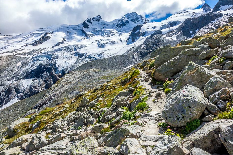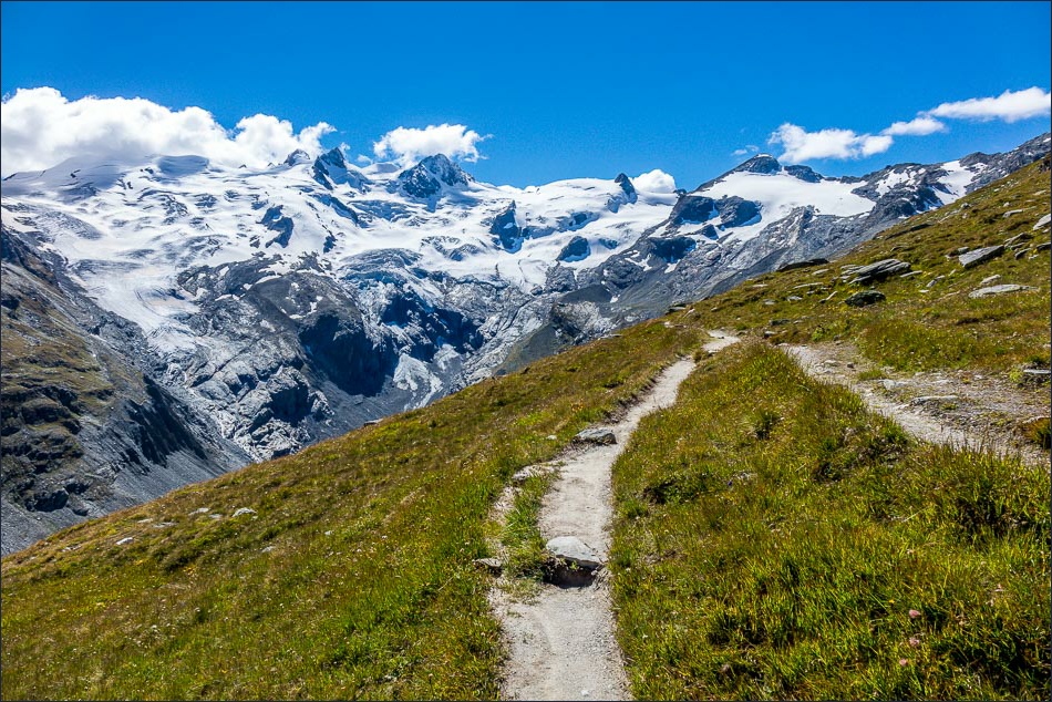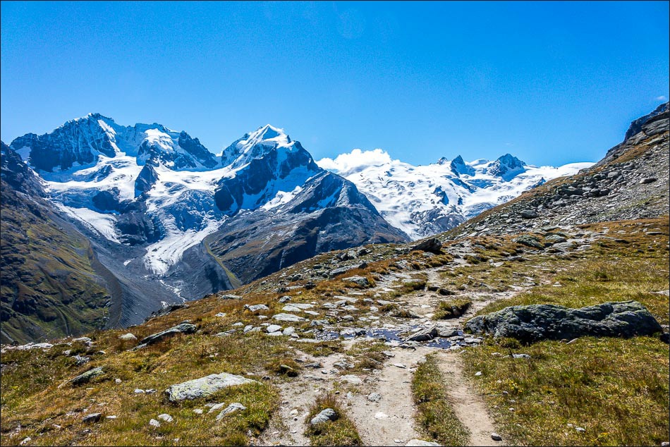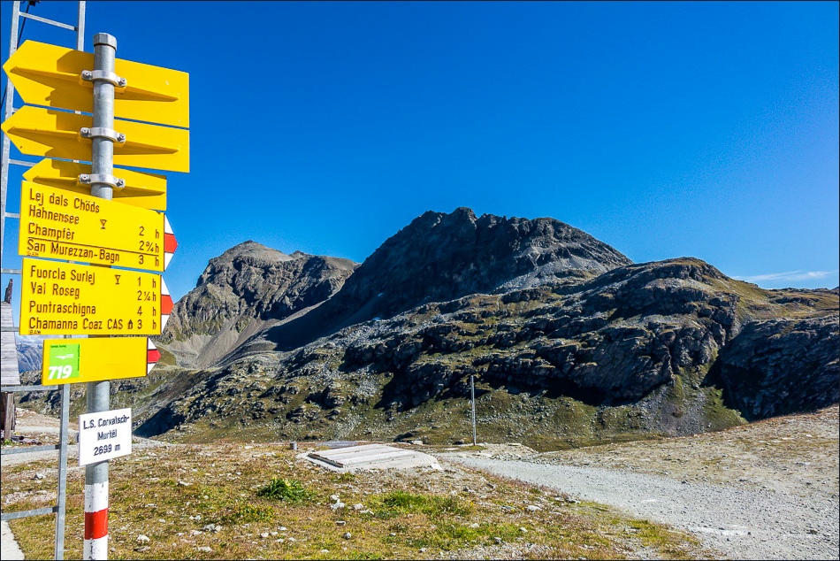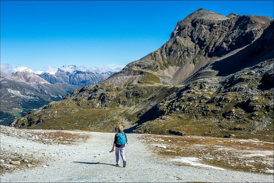 We returned to the middle station on Corvatsch Murtel to start the walk at 8,865 feet. The mountain scenery was awesome and we felt privileged to be up here on such a day