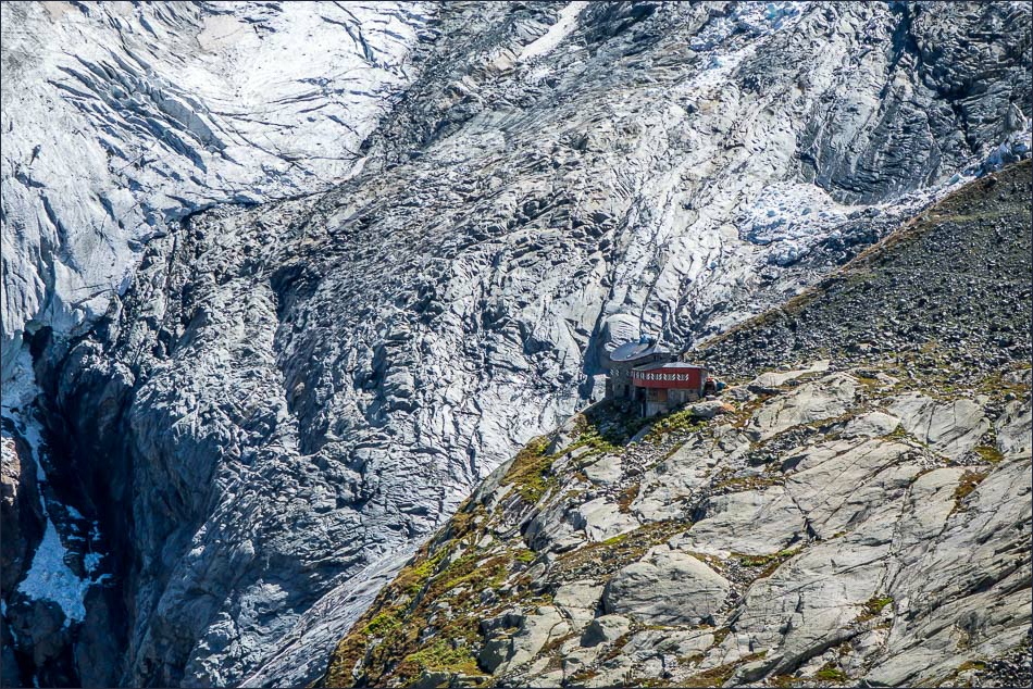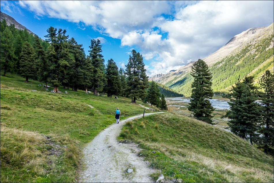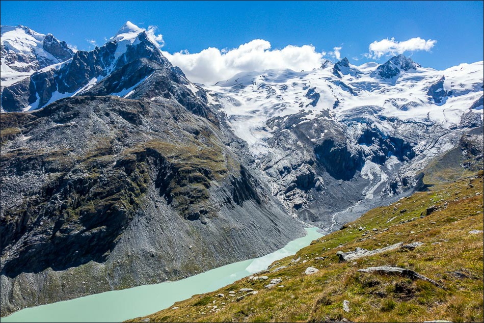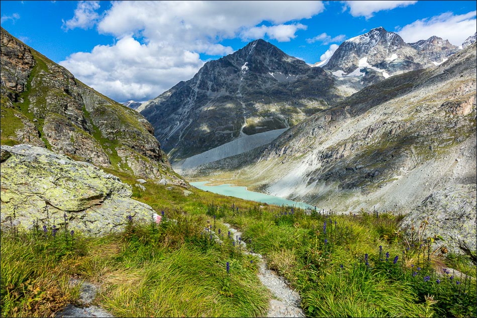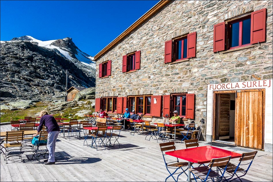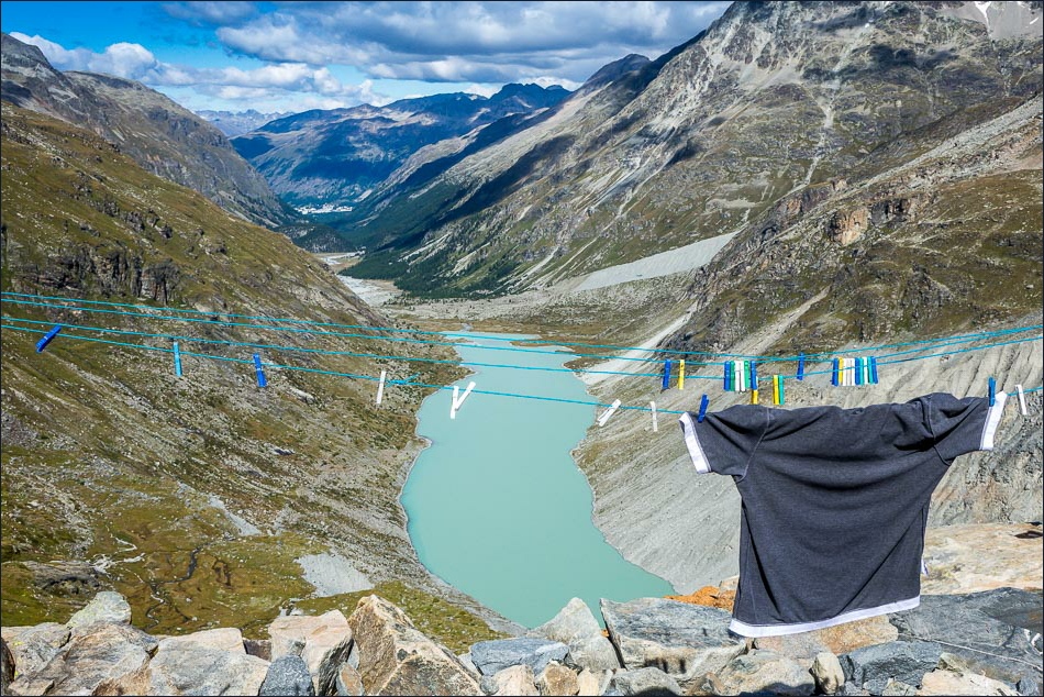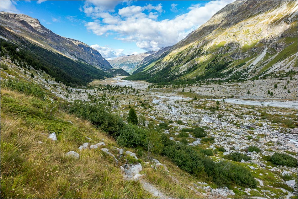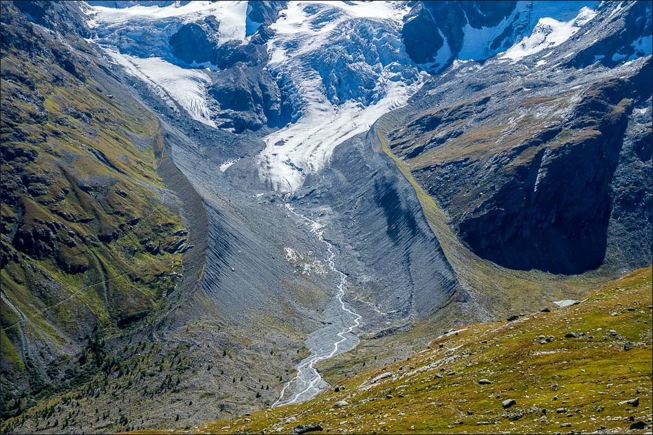 After a late lunch at the Coaz Hut, perched on a rocky platform, looking down the long valley of Val Roseg, we started the descent down into the valley. The going was quite steep and rocky and we were glad to reach the glacial lake Lej dal Vadret, where the terrain became easier. We still had several miles left to walk along the valley back into Pontresina and didn’t arrive back until 7.30pm