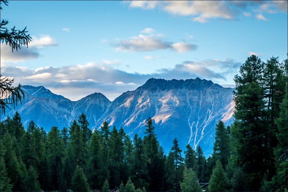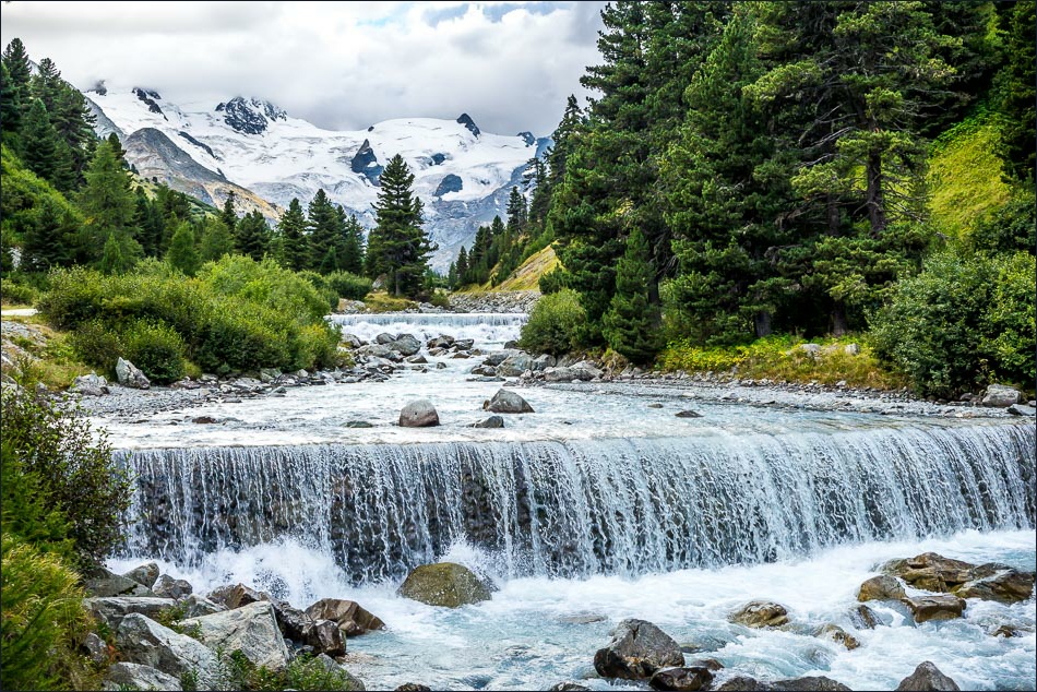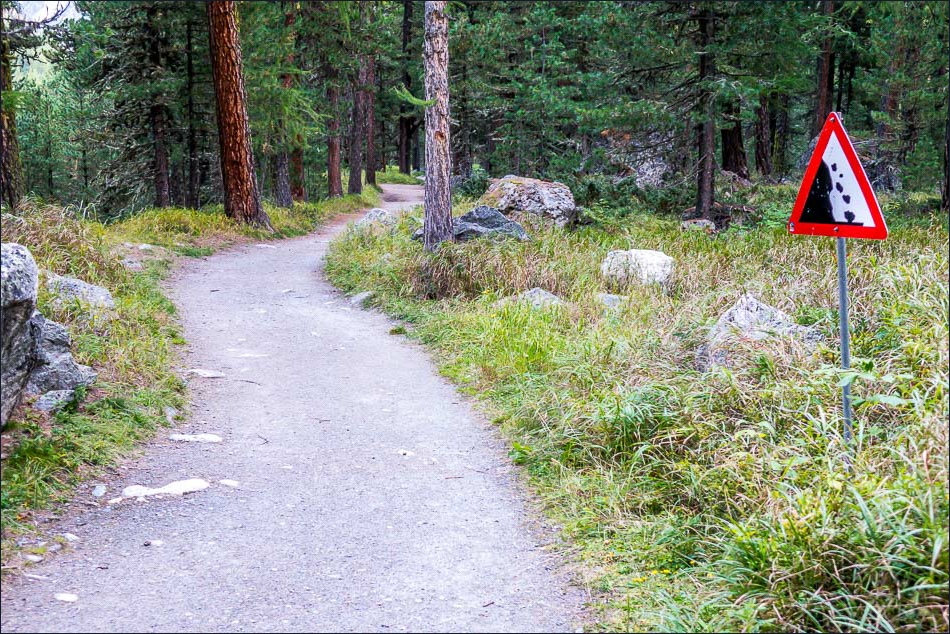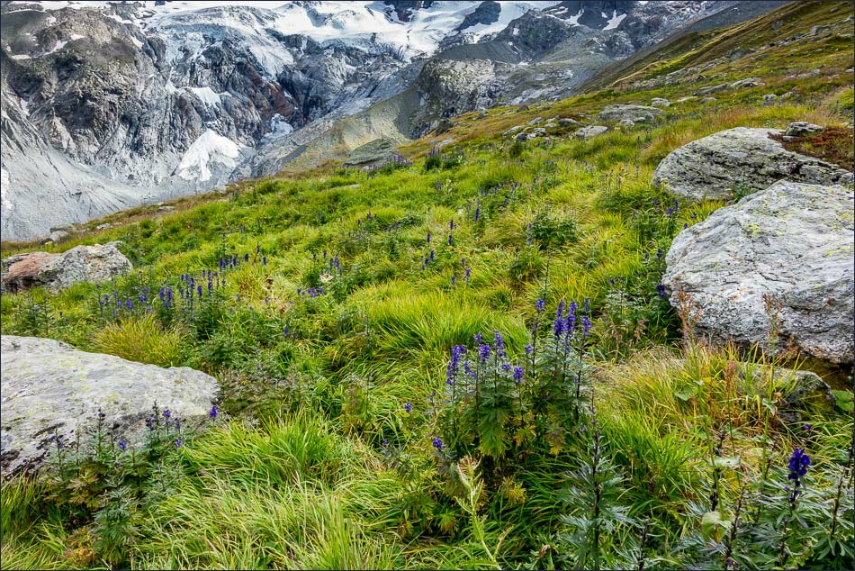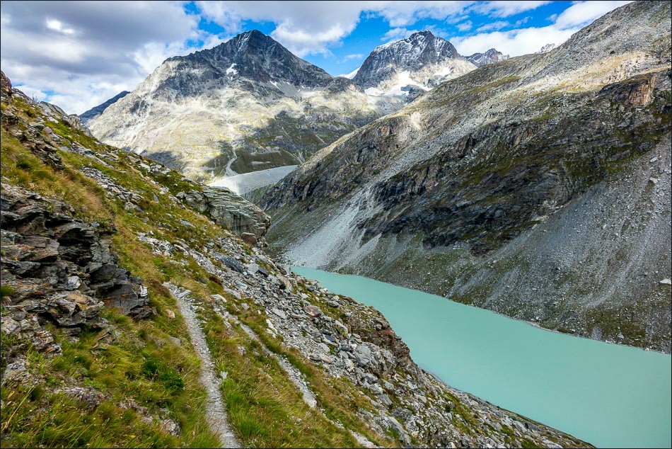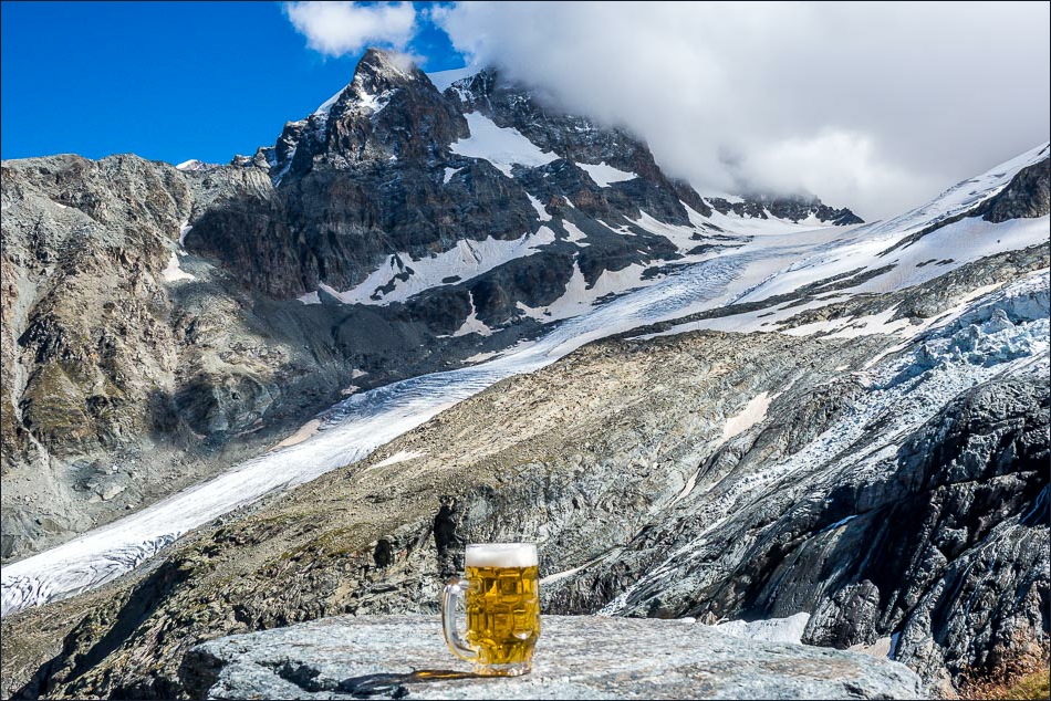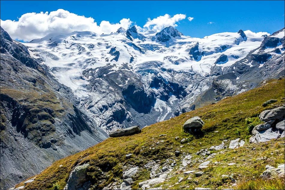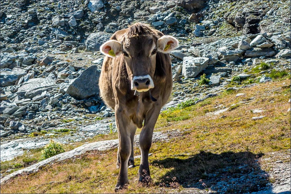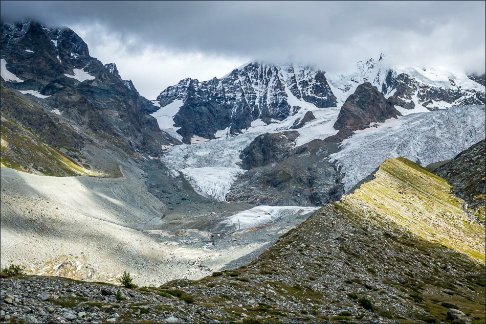 After a late lunch at the Coaz Hut, perched on a rocky platform, looking down the long valley of Val Roseg, we started the descent down into the valley. The going was quite steep and rocky and we were glad to reach the glacial lake Lej dal Vadret, where the terrain became easier. We still had several miles left to walk along the valley back into Pontresina and didn’t arrive back until 7.30pm