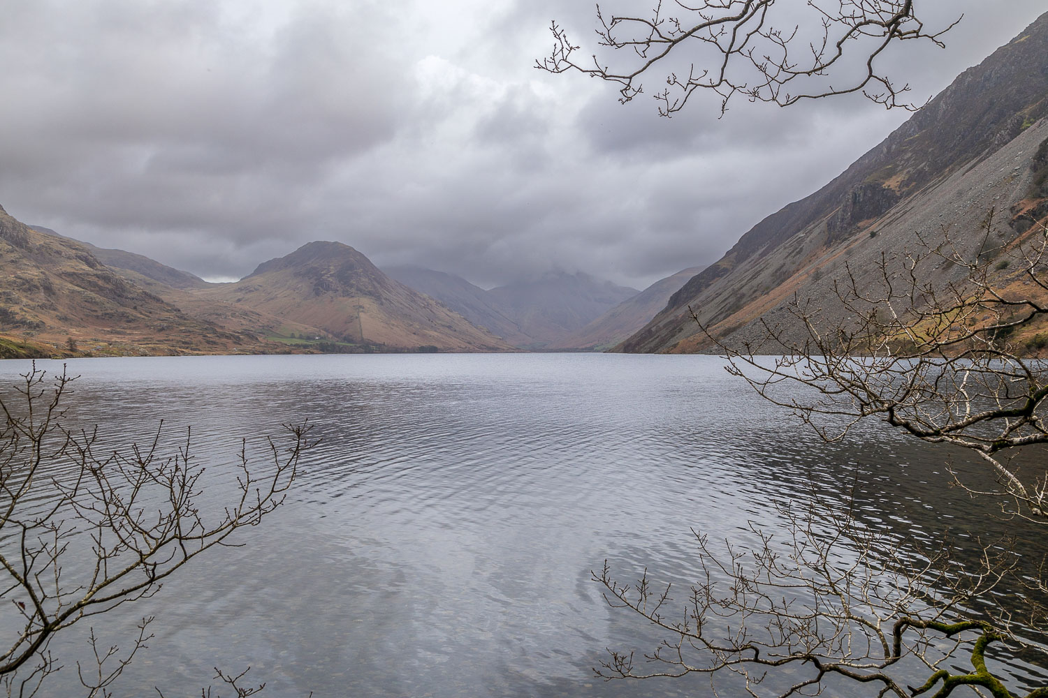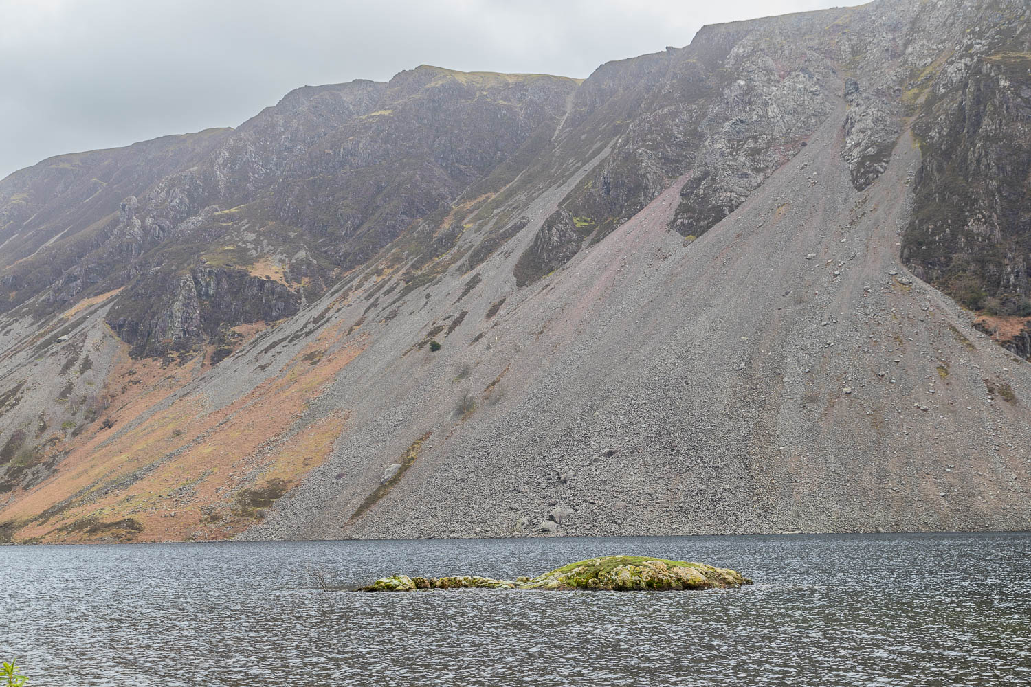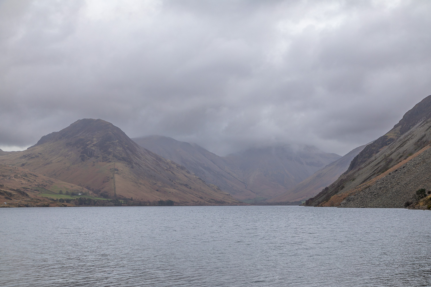 I followed the path around Low Wood, where masses of bluebells will appear later in spring, and arrived at the foot of Wastwater. On a clear day the view from here is one of the finest mountain landscapes in the Lake District. Sadly it was not a clear day today, but the view was impressive all the same
