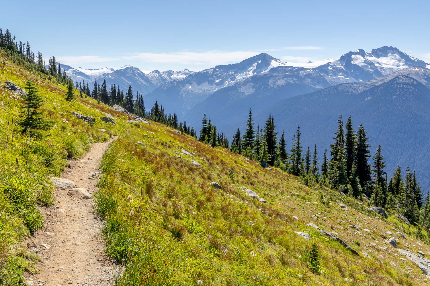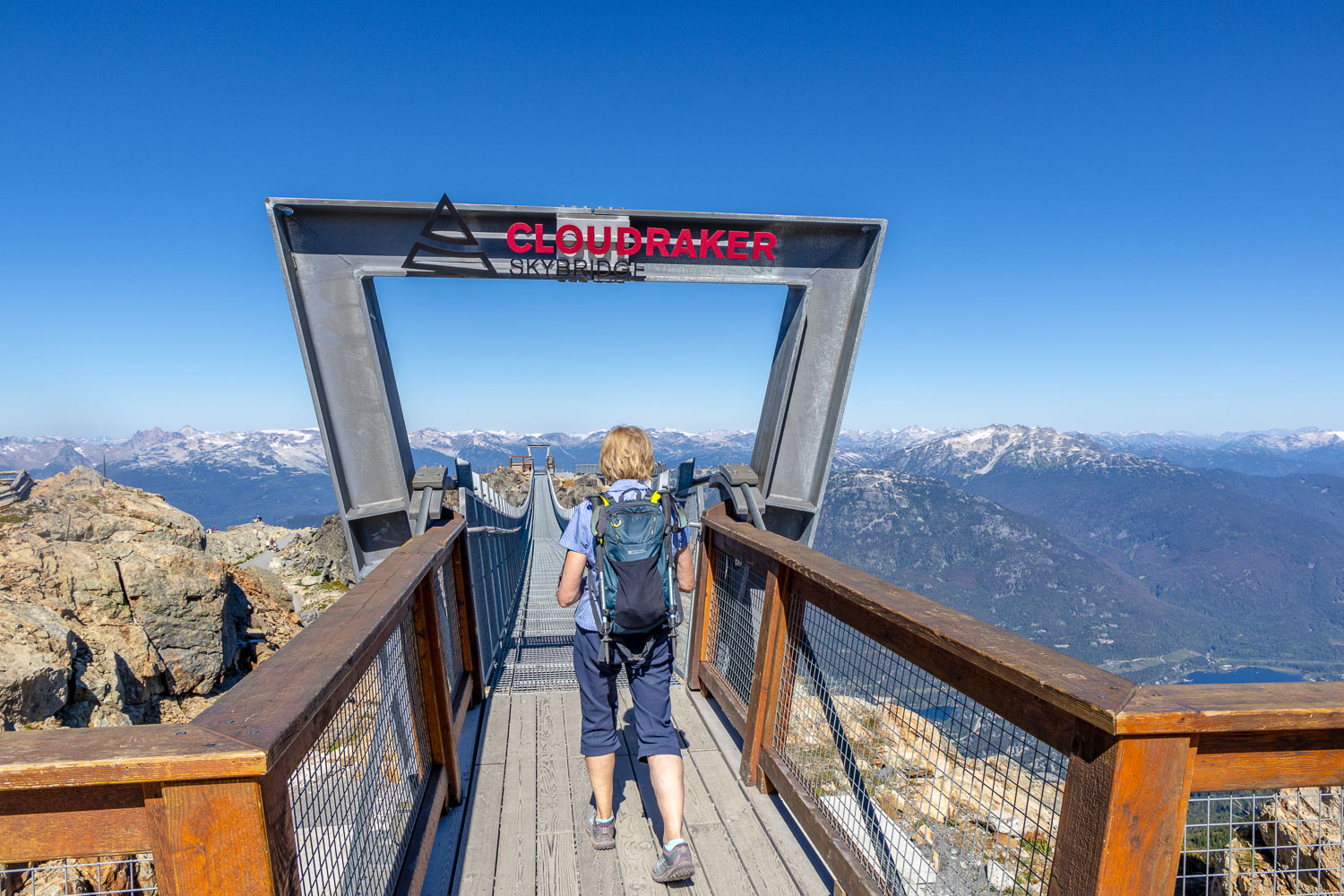Starting with the Whistler Village Gondola, we were taken up Whistler Mountain to the station at Roundhouse Lodge and from here we took the Peak Chair up to the ‘Top of the World Summit’ on Whistler Mountain at a height of 7,160 feet. The summit area has awe inspiring views and is also home to the Cloudraker Skybridge, a narrow suspension bridge leading to West Ridge. Although it wasn’t part of our route, we crossed it for the experience, which was wonderful though rather unsettling when the bridge swayed in the middle section