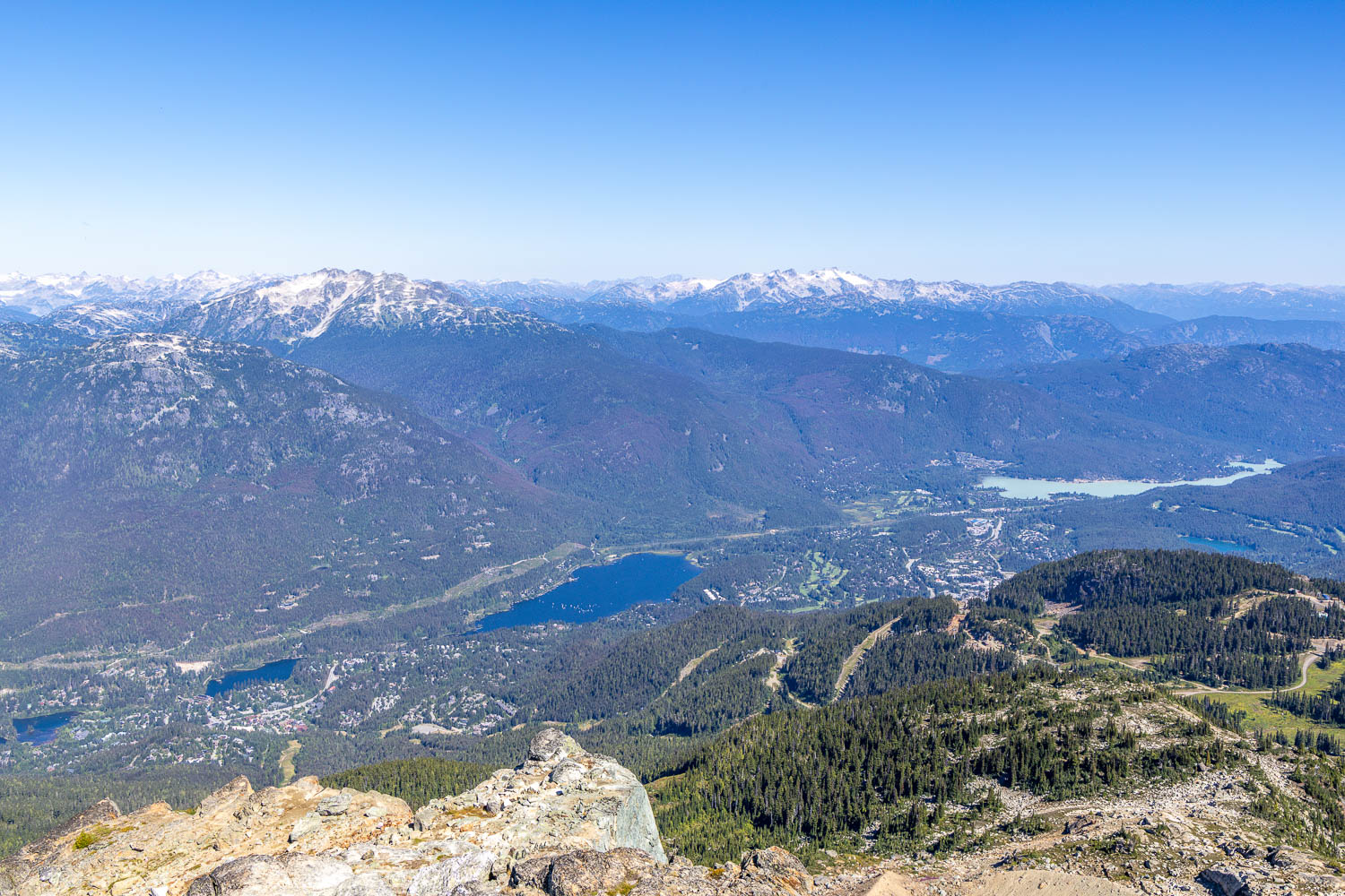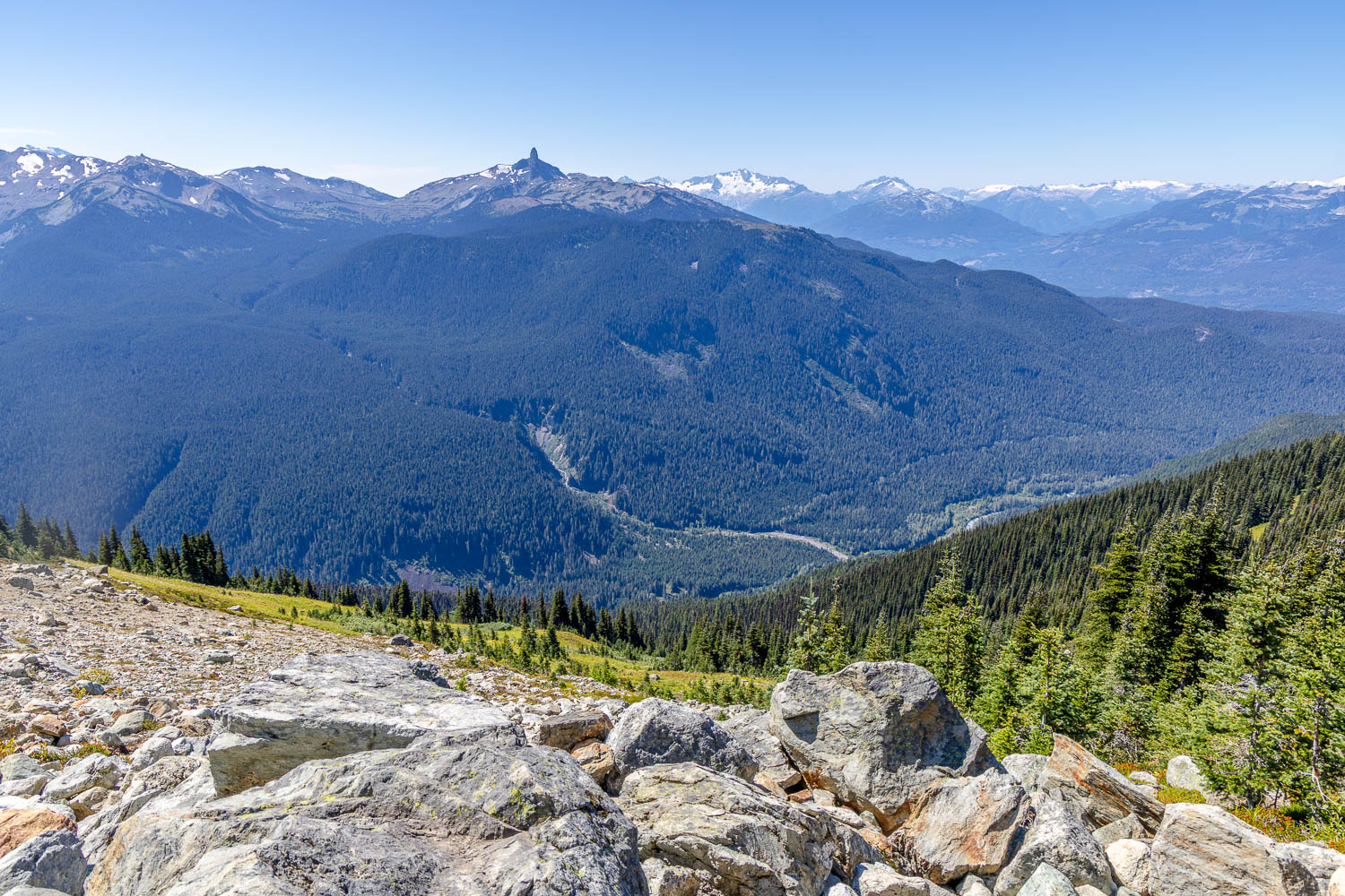 Safely over the bridge, we admire the surrounding peaks from the summit area - the unmistakeable outline of Black Tusk (7,608 feet) a large spire of eroded dark volcanic rock